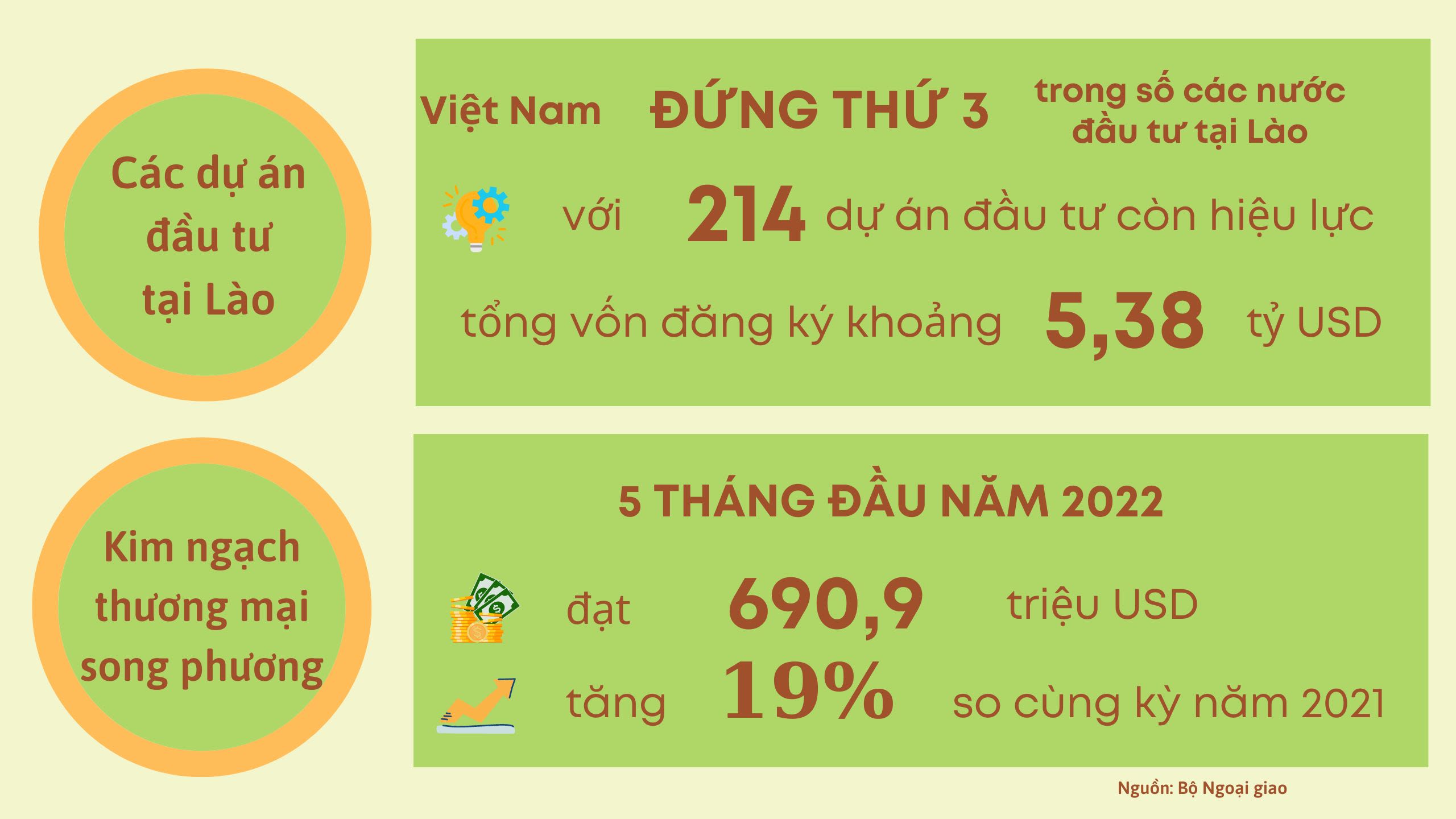 Về đầu tư, Việt Nam hiện có 214 dự án đầu tư sang Lào còn hiệu lực, với tổng vốn đầu tư đăng ký khoảng 5,38 tỷ USD, tiếp tục duy trì vị trí thứ ba trong số các nước có đầu tư tại Lào. Một số dự án đi vào hoạt động đạt hiệu quả tốt, đóng góp vào sự phát triển kinh tế-xã hội và tạo ra việc làm ổn định cho hàng chục nghìn lao động của Lào. Tháng 8/2021, hai bên hoàn thành dự án công trình Nhà Quốc hội mới của Lào. Đây là món quà của Đảng, Nhà nước, nhân dân Việt Nam dành tặng Đảng, Nhà nước và nhân dân Lào, là biểu tượng sinh động của mối quan hệ hữu nghị vĩ đại, đoàn kết đặc biệt giữa hai nước.