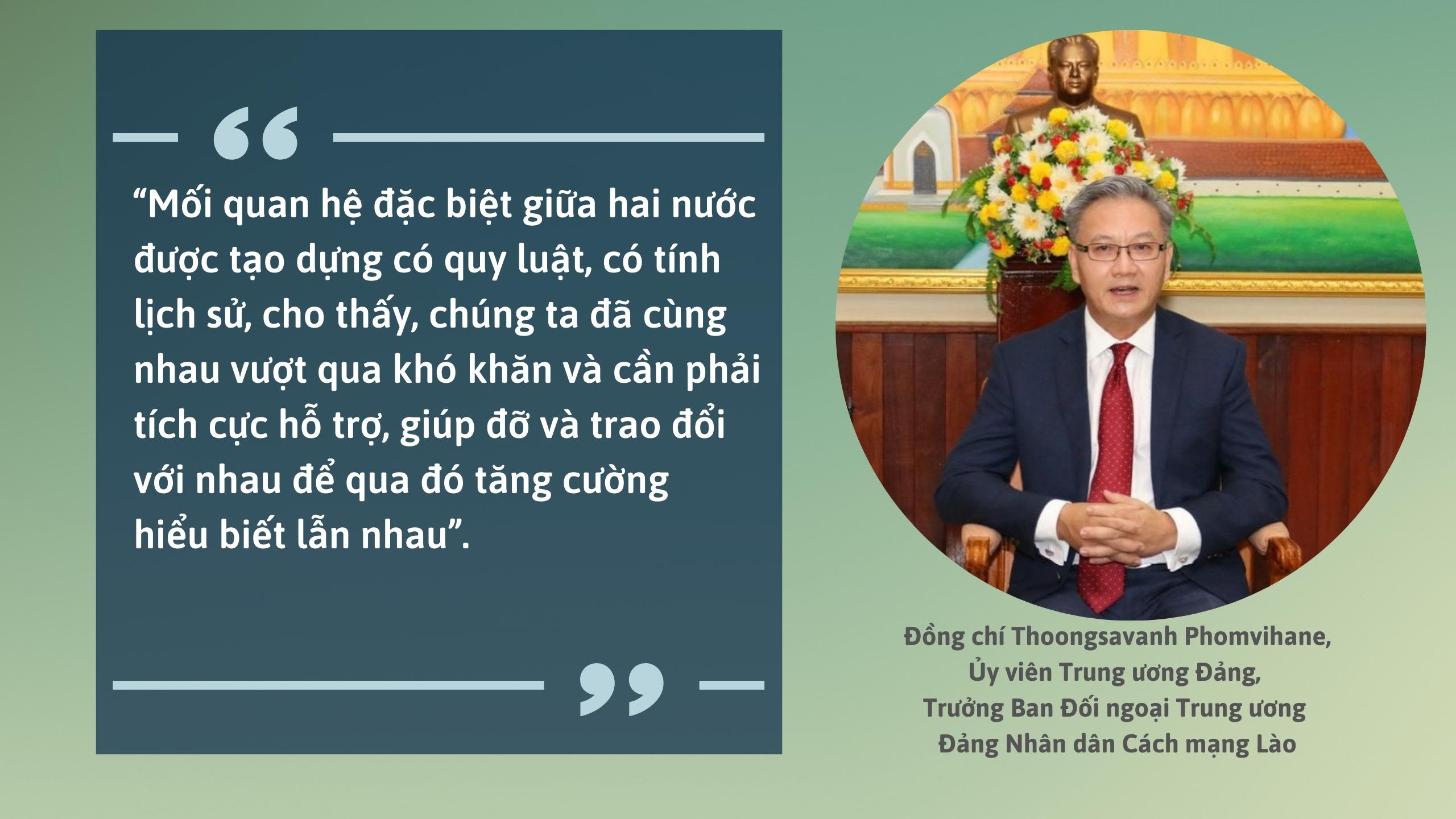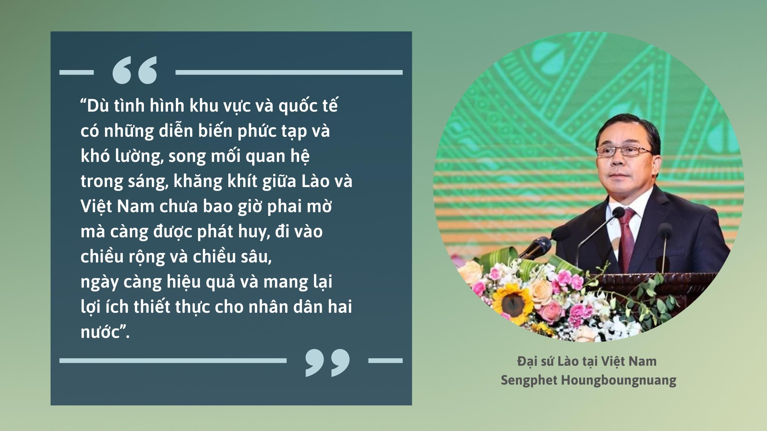 Mối quan hệ truyền thống vĩ đại, tình đoàn kết đặc biệt và hợp tác toàn diện giữa hai dân tộc Lào và Việt Nam do Chủ tịch Hồ Chí Minh, Chủ tịch Kaysone Phomvihane và Chủ tịch Souphanouvong đặt nền móng, đã được thử thách, dày công vun đắp qua nhiều thế hệ, đã trở thành tài sản vô giá của hai dân tộc trên con đường phát triển đất nước phồn vinh, nhân dân ấm no, hạnh phúc.