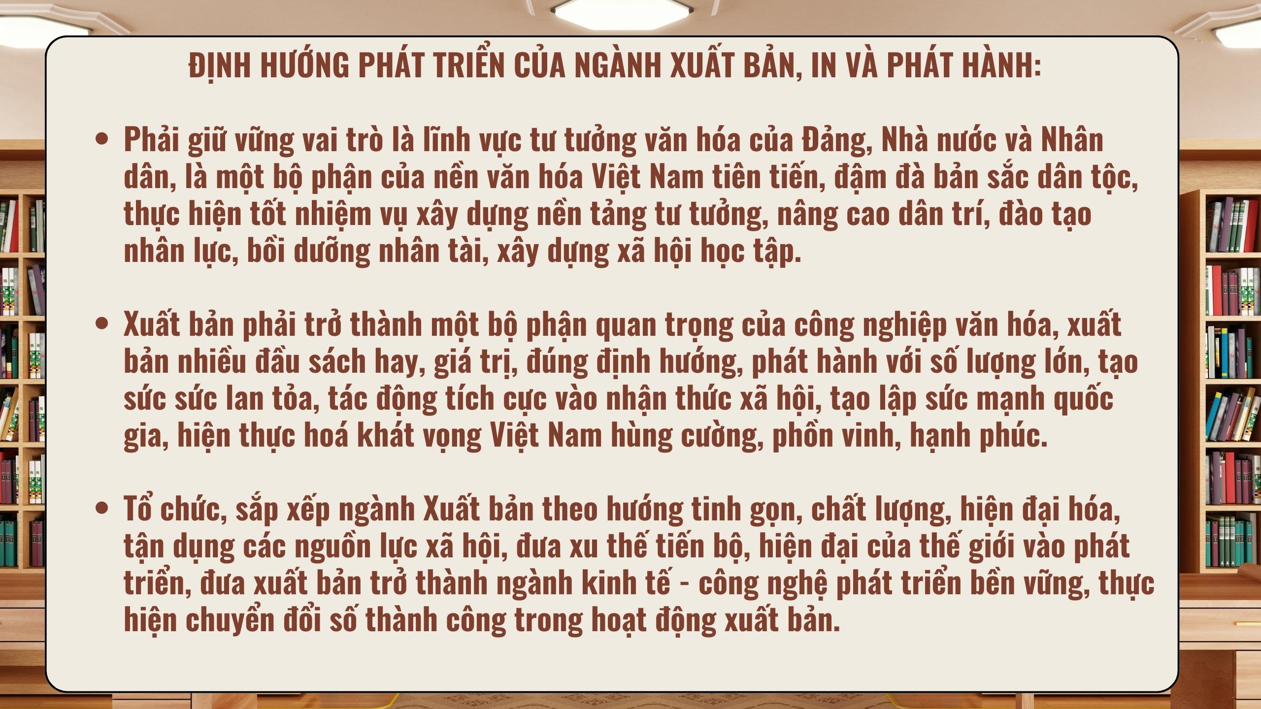 Dưới sự lãnh đạo, chỉ đạo toàn diện của Đảng, ngành Xuất bản, In và Phát hành đã không ngừng lớn mạnh và có nhiều đóng góp quan trọng vào sự nghiệp xây dựng và bảo vệ Tổ quốc, trở thành một bộ phận quan trọng của nền văn hoá Việt Nam tiên tiến, đậm đà bản sắc dân tộc.
