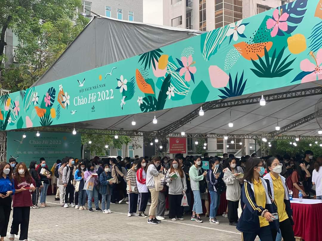 Bạn đọc xếp hàng chờ thanh toán tiền tại Hội sách chào hè 2022 của Nhã Nam.