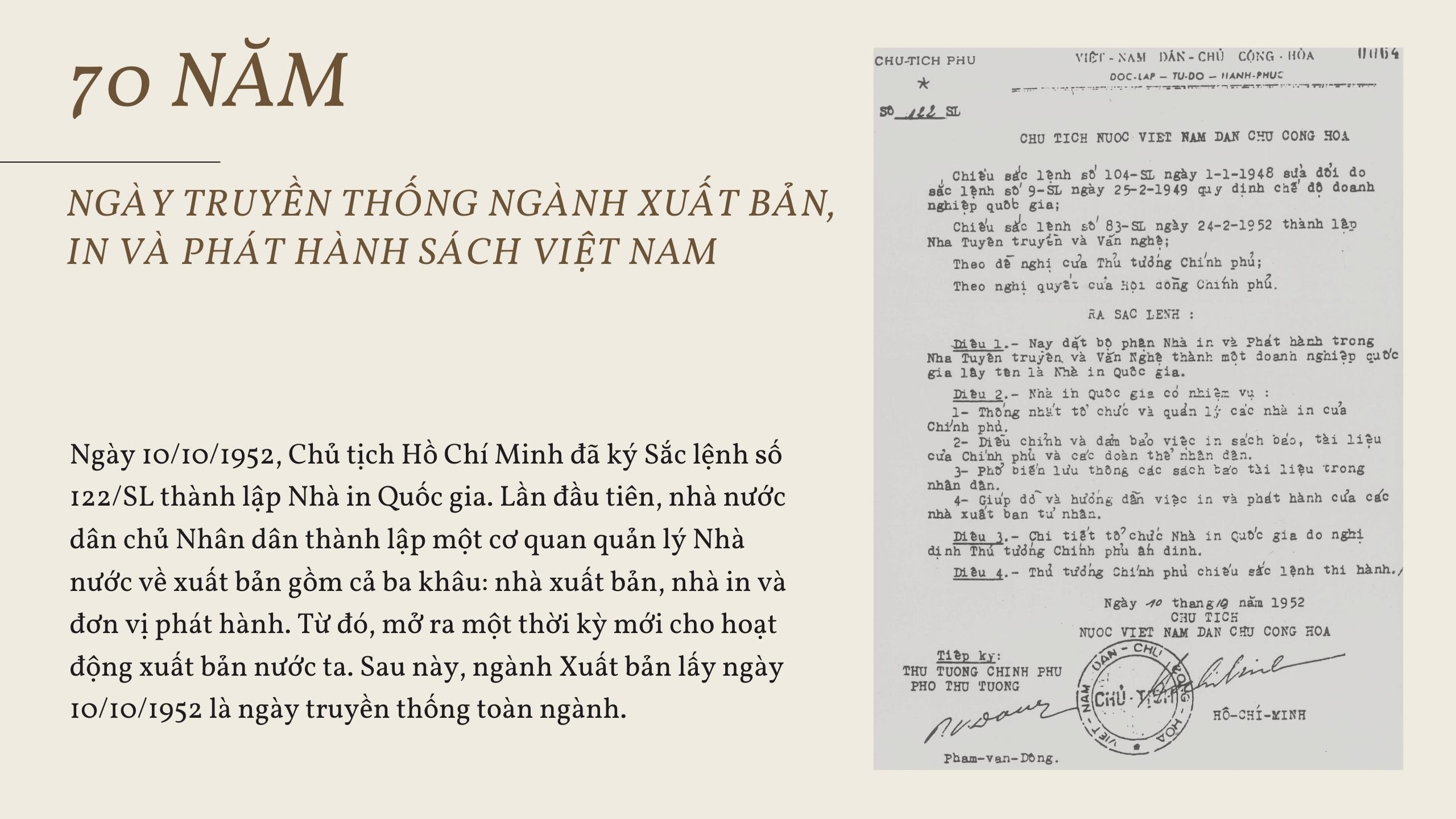 Năm 1952, cuộc kháng chiến chống thực dân Pháp chuyển sang giai đoạn quyết định, chuẩn bị cho Chiến dịch Điện Biên Phủ lịch sử, đòi hỏi về sách báo ngày càng tăng cả về số lượng và chất lượng. Trong bối cảnh đó, ngày 10/10/1952, Chủ tịch Hồ Chí Minh đã ký Sắc lệnh 122/SL thành lập Nhà in quốc gia. Lần đầu tiên ngành Xuất bản có một cơ quan vừa là doanh nghiệp quốc gia vừa là cơ quan quản lý nhà nước thống nhất trên cả ba khâu: xuất bản, in và phát hành trong phạm vi cả nước. Đây là mốc son thứ hai đánh dấu một giai đoạn mới, ngành Xuất bản cách mạng non trẻ giờ đây đã tạo dựng được nền móng để lớn mạnh và phát triển. Ngày 10/10 giờ đây đã trở thành ngày truyền thống của ngành Xuất bản, In và Phát hành sách Việt Nam.