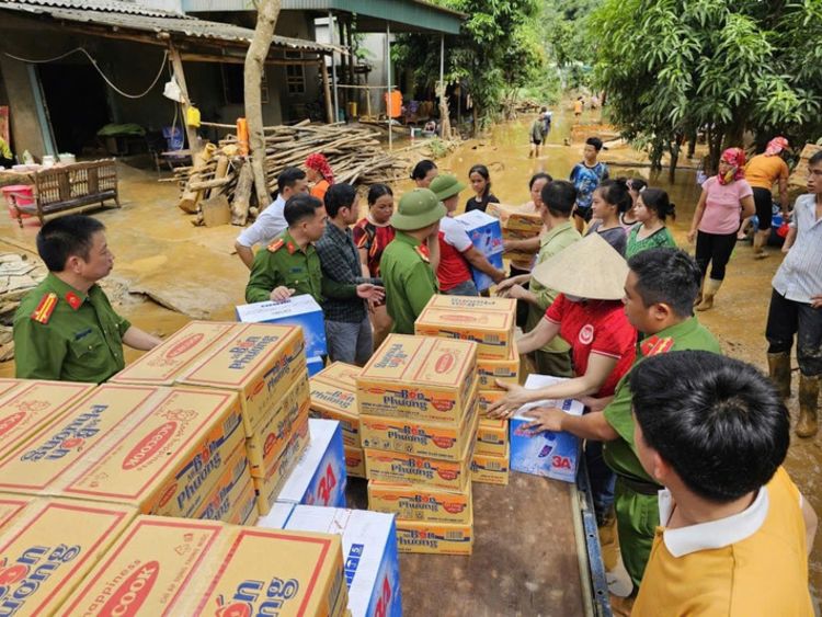 Công an huyện Bảo Yên mang đồ tiếp tế tới các thôn, bản bị ảnh hưởng nặng bởi hoàn lưu bão số 3.