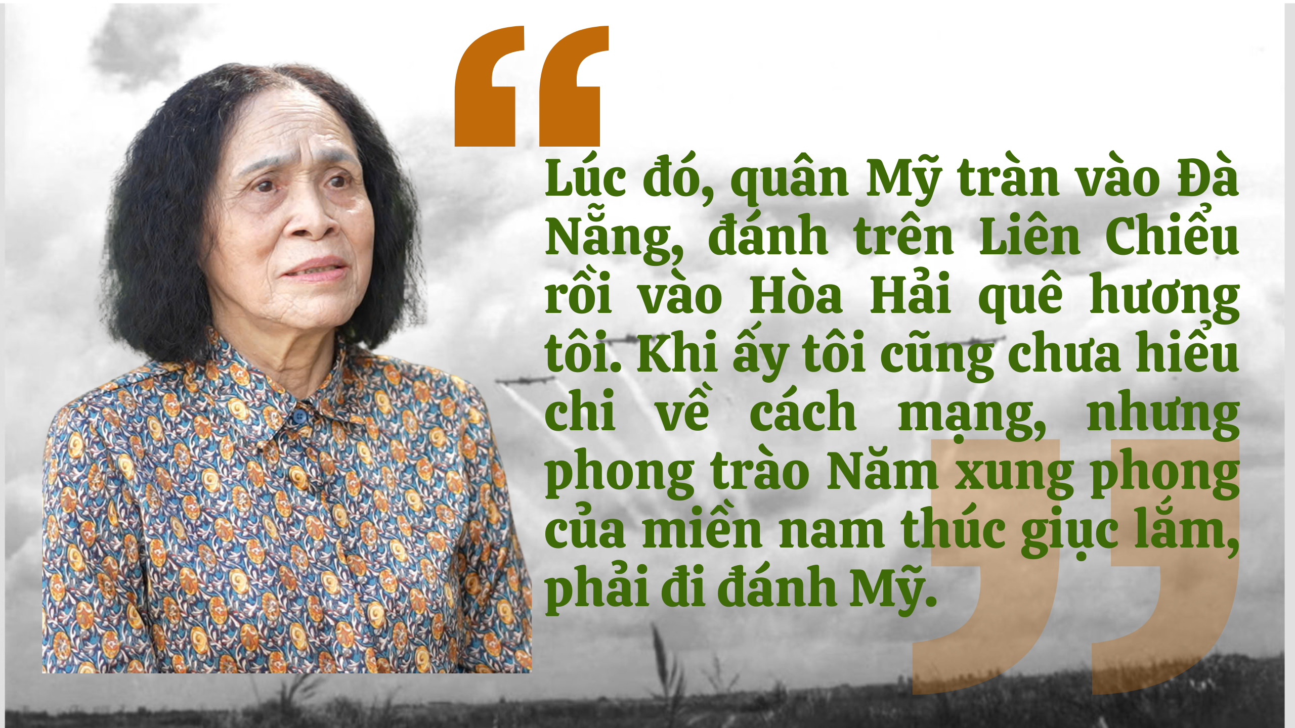 “Lúc đó, quân Mỹ tràn vào Đà Nẵng, đánh trên Liên Chiểu rồi vào Hòa Hải quê hương tôi. Khi ấy tôi cũng chưa hiểu chi về cách mạng, nhưng phong trào Năm xung phong của miền nam thúc giục lắm, phải đi đánh Mỹ” - Anh hùng Phạm Thị Thao nhớ lại.