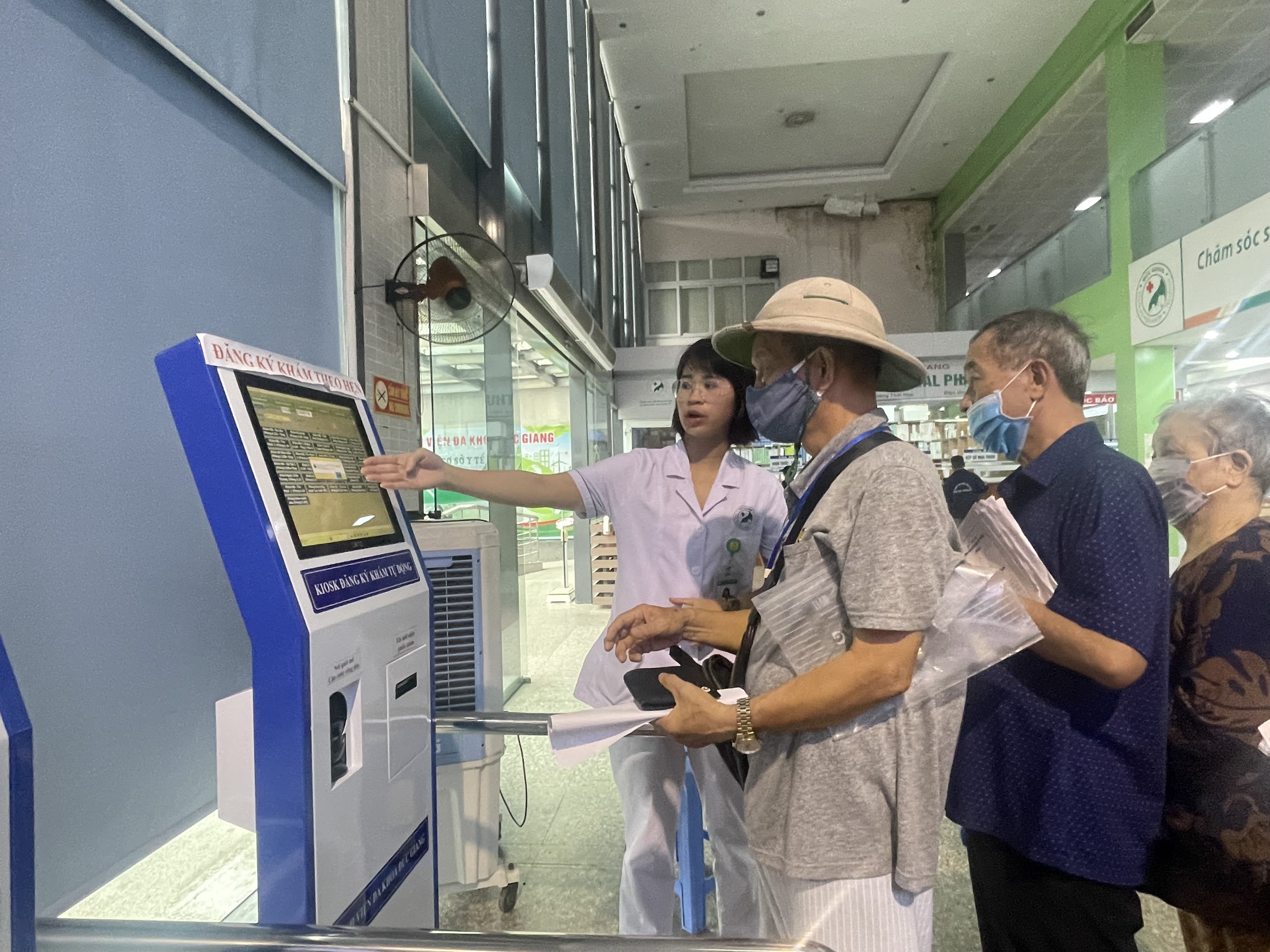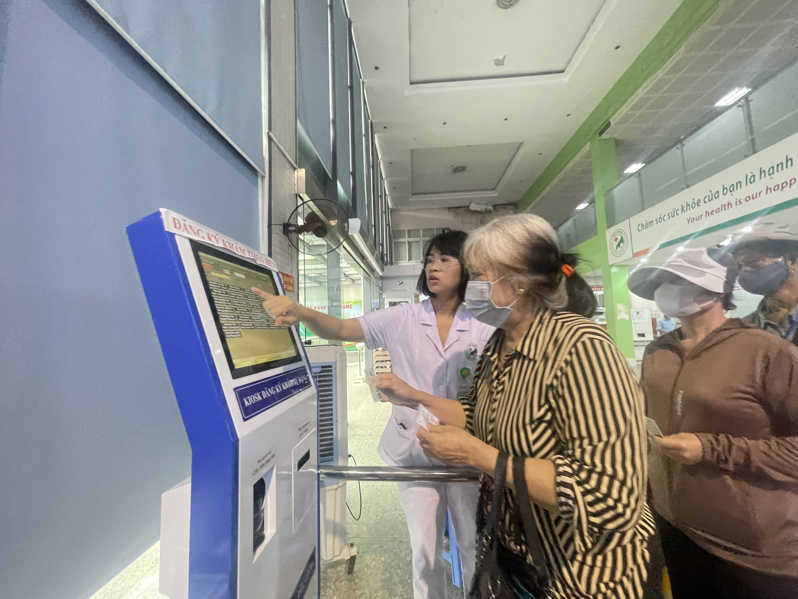 Nhân viên y tế hướng dẫn bệnh nhân thực hiện đăng ký khám tự động tại kiosk.