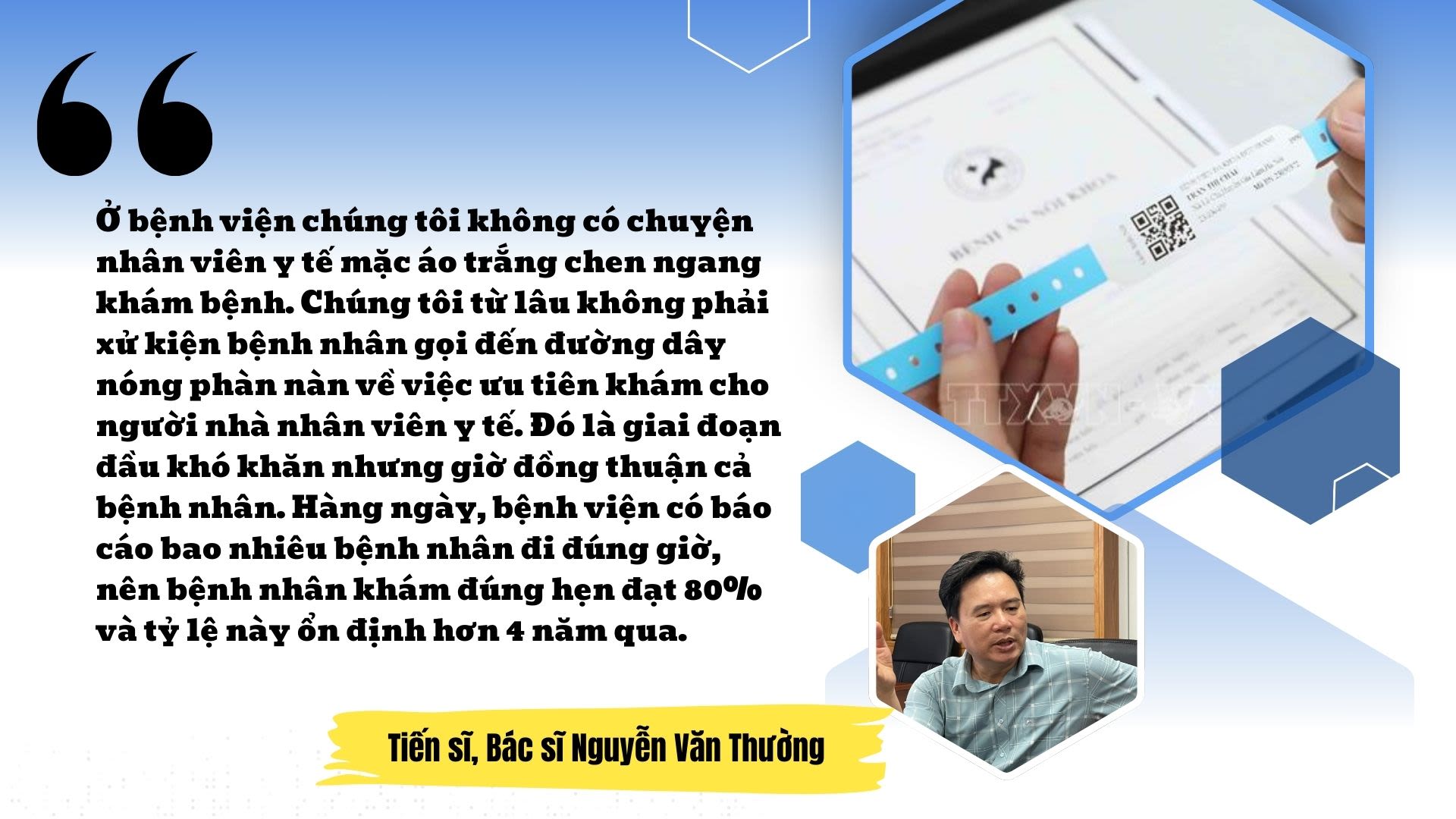 Nhưng với sự kiên quyết tuân thủ lịch hẹn khám ở các phòng, bệnh nhân đến khám rất đúng lịch vì họ biết chắc chắc giờ này của mình, không một ai chen ngang. “Ở bệnh viện chúng tôi không có chuyện nhân viên y tế mặc áo trắng chen ngang khám bệnh. Chúng tôi từ lâu không phải xử kiện bệnh nhân gọi đến đường dây nóng phàn nàn về việc ưu tiên khám cho người nhà nhân viên y tế. Đó là giai đoạn đầu khó khăn nhưng giờ đồng thuận cả bệnh nhân. Hàng ngày, bệnh viện có báo cáo bao nhiêu bệnh nhân đi đúng giờ, nên bệnh nhân khám đúng hẹn đạt 80% và tỷ lệ này ổn định hơn 4 năm qua”, ông Thường tự hào nói.