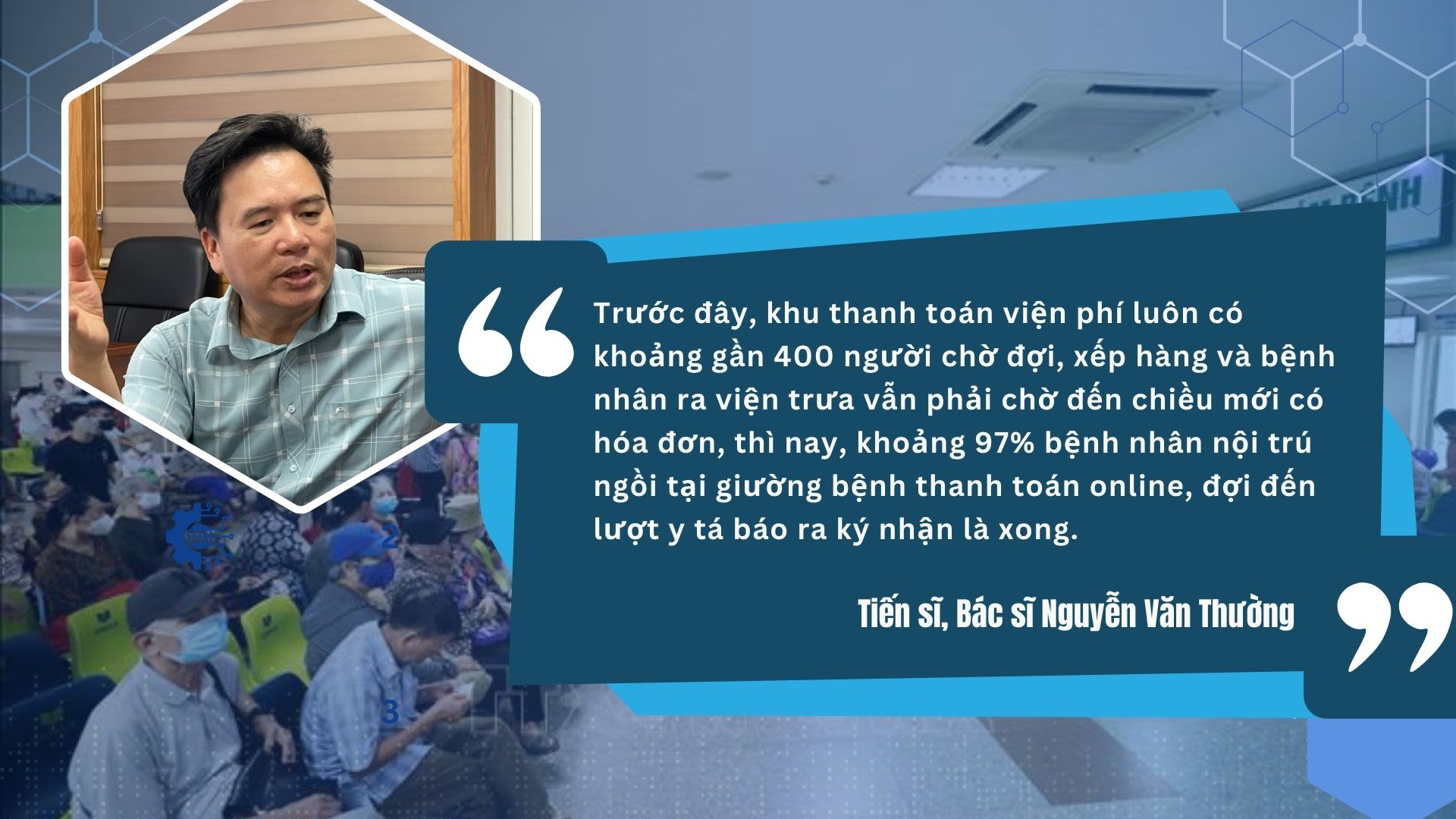 “Trước đây, khu thanh toán viện phí luôn có khoảng gần 400 người chờ đợi, xếp hàng và bệnh nhân ra viện trưa vẫn phải chờ đến chiều mới có hóa đơn, thì nay, khoảng 97% bệnh nhân nội trú ngồi tại giường bệnh thanh toán online, đợi đến lượt y tá báo ra ký nhận là xong”, ông Thường nói.
