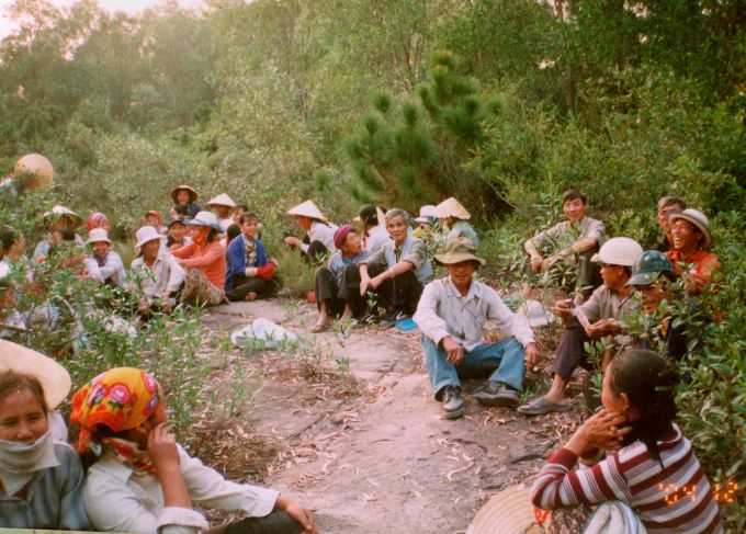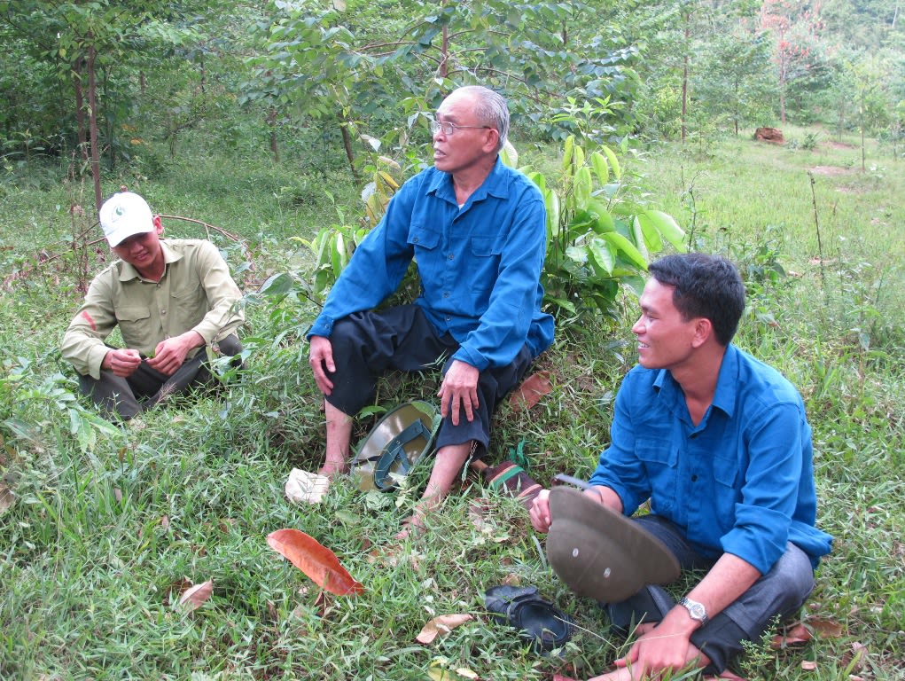 Ông Lê Duy Nguyên (hàng sau cùng, thứ ba bên phải sang) ngồi giải lao cùng công nhân trong rừng.