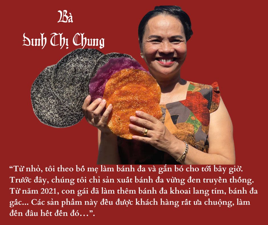 Chúng tôi về với Đô Lương – Nghệ An vào một ngày mùa xuân mưa bụi lây phây, tiết trời mát mẻ, khi những hộ dân Đô Lương đã kết thúc một vụ bánh đa Tết sôi động và chuẩn bị cho một vụ bánh mới. Đón chúng tôi trong căn nhà rộng, giữa mùi thơm ấm sực của bánh đa vừa nướng chín tới, bà Đinh Thị Chung (57 tuổi) - một trong những hộ làm nghề bánh đa lâu đời ở làng Vĩnh Đức kể: “Từ nhỏ, tôi theo bố mẹ làm bánh đa và gắn bó cho tới bây giờ. Trước đây, chúng tôi chỉ sản xuất bánh đa vừng đen truyền thống. Từ năm 2021, con gái đã làm thêm bánh đa khoai lang tím, bánh đa gấc... Các sản phẩm này đều được khách hàng rất ưa chuộng, làm đến đâu hết đến đó…”.
