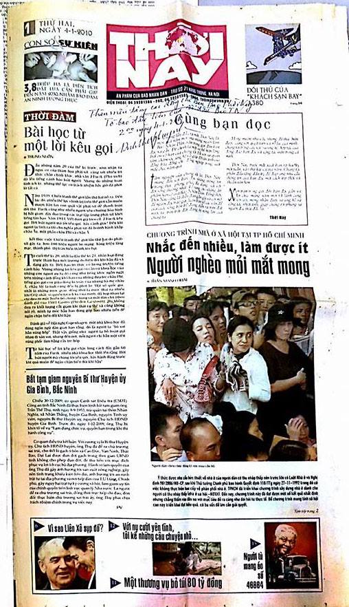 Bản in đầu tiên của số báo Thời Nay đầu tiên với lời đề của Nguyên Tổng biên tập Báo Nhân Dân Đinh Thế Huynh, xuất bản sáng 4/1/2010.