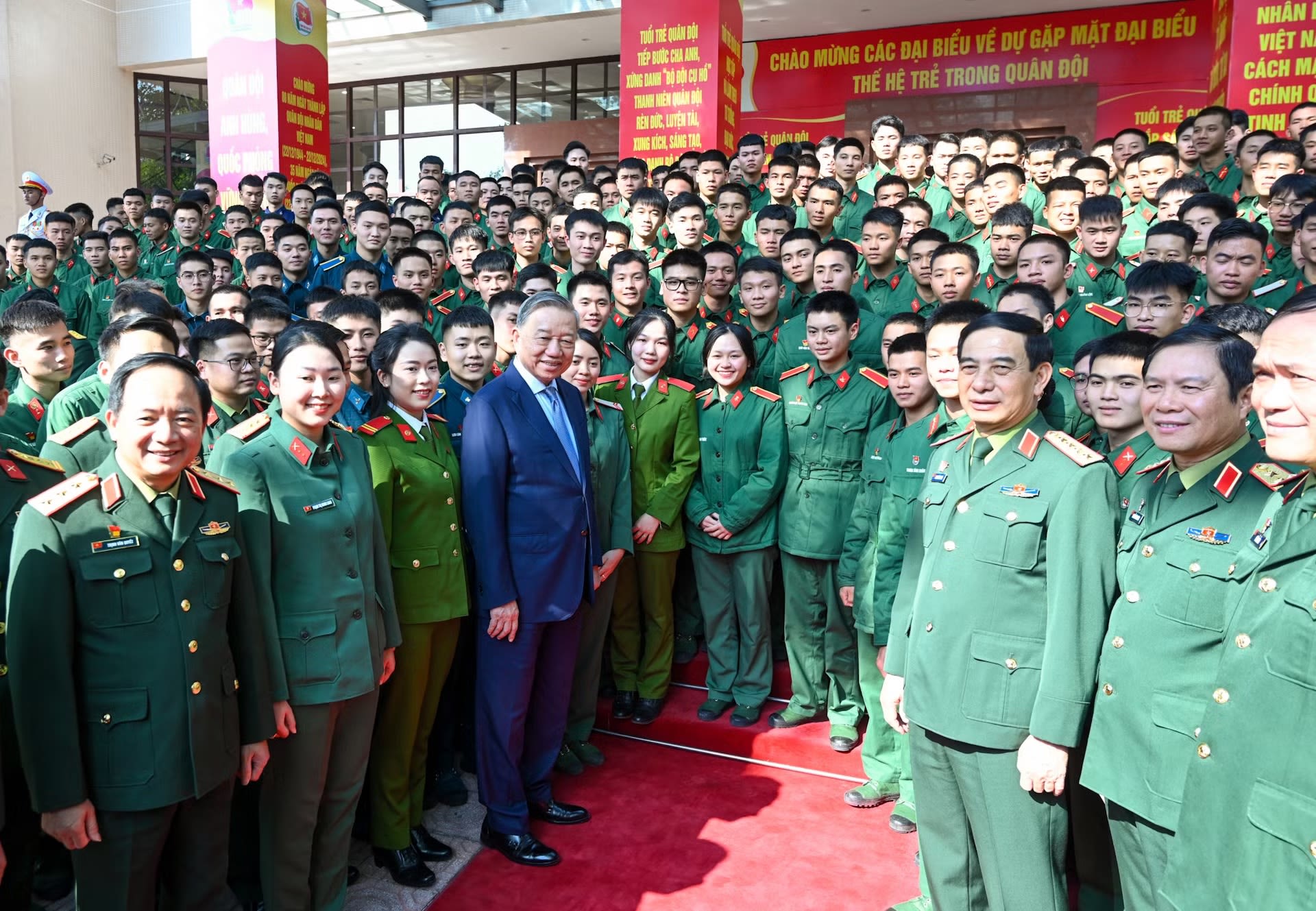 Tổng Bí thư Tô Lâm cùng các đồng chí lãnh đạo Bộ Quốc phòng và các đại biểu thế hệ trẻ trong Quân đội, tháng 12/2024.