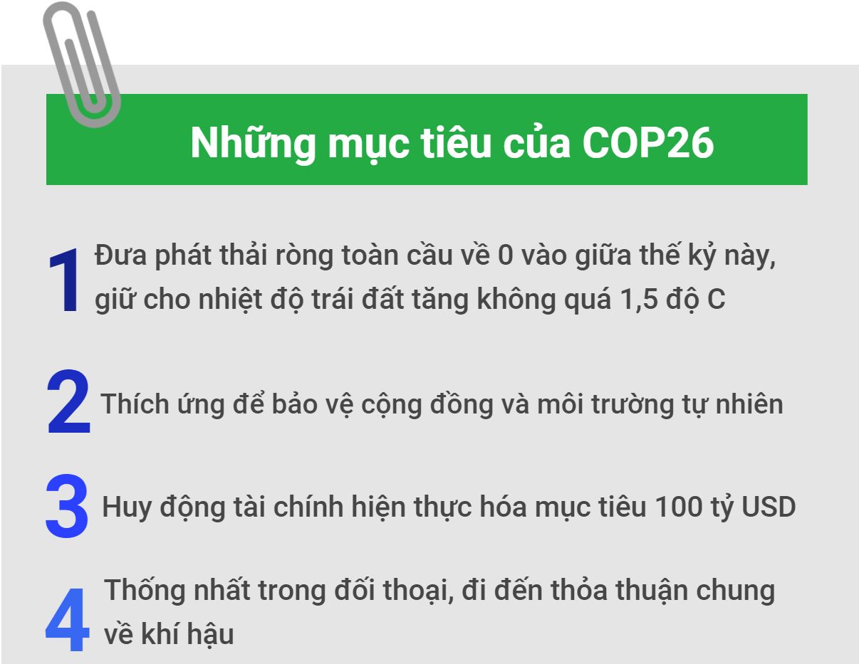 Trước thềm hội nghị, Ban Tổ chức COP26 đã công bố những mục tiêu mà thế giới cần đạt được thông qua hội nghị này nhằm thúc đẩy cuộc chiến chống biến đổi khí hậu trên toàn cầu.