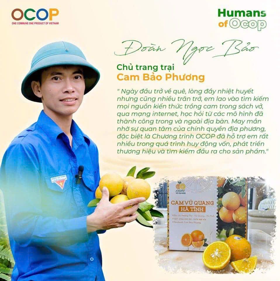 Hiện, Cam Bảo Phương đạt tiêu chuẩn VietGAP về sản phẩm sạch, được cấp tem nhãn chứng nhận thương hiệu Cam Vũ Quang, có chỉ dẫn địa lý; được người tiêu dùng ở Hà Tĩnh, Nghệ An, Hà Nội, Đà Nẵng, Thừa Thiên-Huế,… đón nhận, tiêu thụ. Đặc biệt, cam của Trang trại Bảo Phương đã đạt sản phẩm OCOP 3 sao và đủ điều kiện đạt OCOP 4 sao, chờ được cấp chứng nhận trong năm 2025. Đây là điều kiện thuận lợi giúp Bảo đẩy nhanh những dự định đang ấp ủ.