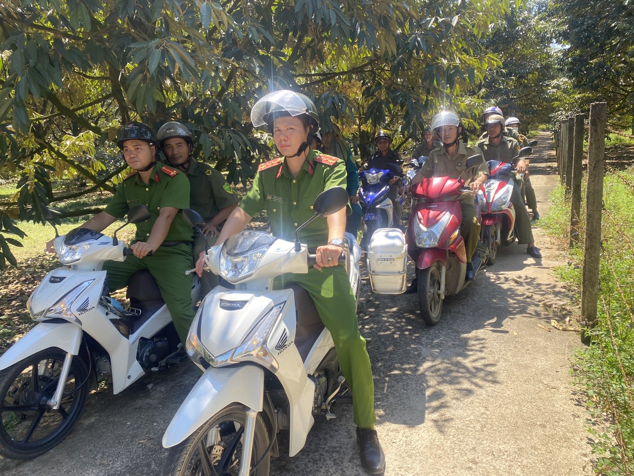 Công an xã cùng các lực lượng tuần tra bảo đảm an ninh trật tự mùa vụ sầu riêng.
