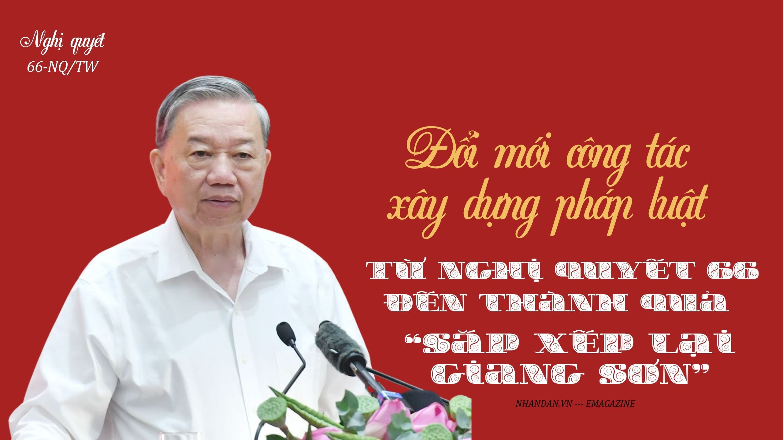 Trong bài viết với nhan đề: “Đột phá thể chế, pháp luật để đất nước vươn mình”, Tổng Bí thư Tô Lâm đã nhấn mạnh: “Để hiện thực hóa khát vọng vươn mình của dân tộc, chúng ta phải giải quyết nhiều việc, trong đó, một nhiệm vụ rất trọng tâm là phải tiếp tục quan tâm hoàn thiện thể chế, pháp luật để giải phóng toàn bộ sức sản xuất, khơi thông mọi nguồn lực, phát huy mọi tiềm năng, thế mạnh của đất nước, tận dụng mọi cơ hội phát triển. Chính vì thế, cùng với việc thực hiện cuộc cách mạng về tinh gọn tổ chức bộ máy, phấn đấu tăng trưởng kinh tế “hai con số”, công tác xây dựng và thi hành pháp luật phải được đổi mới căn bản. Đáp ứng đòi hỏi đó, ngày 30/4/2025, trong không khí thiêng liêng và hào hùng của dịp kỷ niệm 50 năm thống nhất đất nước, Bộ Chính trị đã ban hành Nghị quyết số 66-NQ/TW về “Đổi mới công tác xây dựng và thi hành pháp luật đáp ứng yêu cầu phát triển đất nước trong kỷ nguyên mới” - một Nghị quyết chuyên đề đặc biệt quan trọng với nhiều quyết sách chiến lược”.