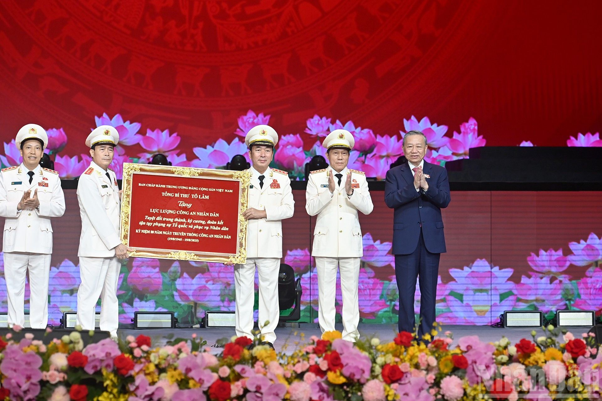 Tổng Bí thư Tô Lâm trao bức trướng tặng lực lượng Công an nhân dân Việt Nam.