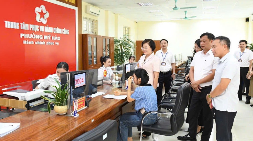 Đoàn công tác của Tỉnh uỷ Hưng Yên kiểm tra công tác triển khai vận hành chính quyền 2 cấp tại phường Mỹ Hào. (Ảnh: LÊ HIẾU)