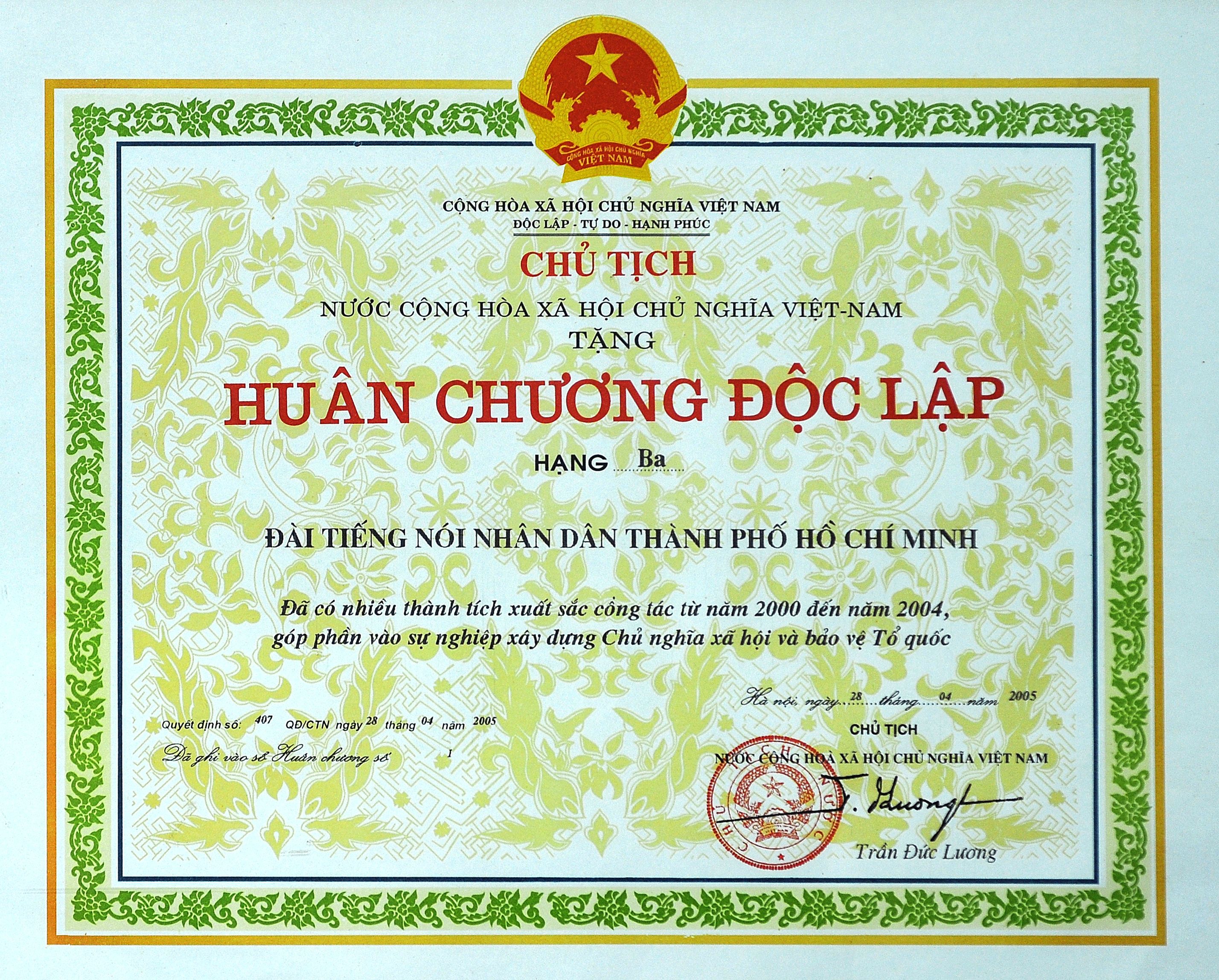 Với sự cố gắng nỗ lực và những thành tích xuất sắc, tập thể Đài Tiếng nói nhân dân Thành phố Hồ Chí Minh vinh dự đón nhận Huân chương Độc lập hạng Ba do Chủ tịch nước Trần Đức Lương ký tặng
