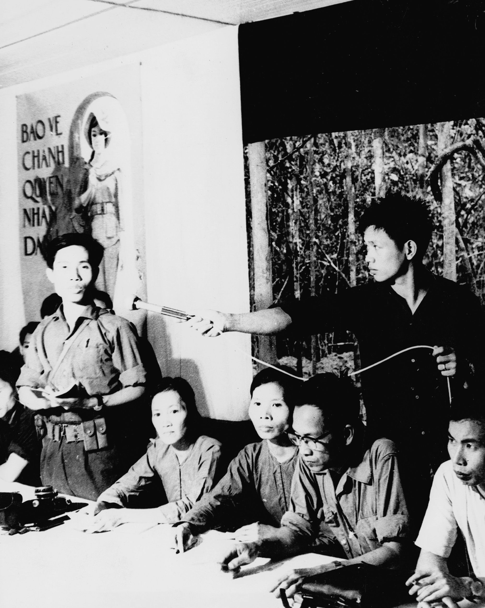 Trong khói lửa chiến tranh, đội ngũ cán bộ, biên tập, kỹ thuật của đài luôn đưa tin, bình luận kịp thời, góp phần cổ vũ quân dân cả nước đứng lên làm nên đại thắng mùa Xuân 1975 thu non sông về một mối, Nam Bắc sum họp một nhà. Ảnh: Cán bộ kỹ thuật phòng Bá âm - Đài Phát thanh Giải Phóng đang thu lưu động tại một Hội nghị của Trung ương Cục miền Nam ở chiến khu.