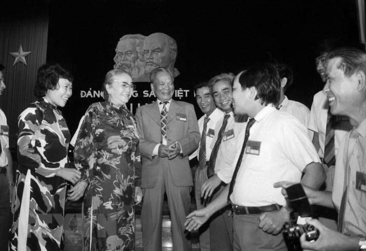 Chủ tịch nước Lê Đức Anh và Phó Chủ tịch Hội đồng Nhà nước Nguyễn Thị Định gặp gỡ các đại biểu dự Đại hội VII Đảng Cộng sản Việt Nam, ngày 24/6/1991, tại Hà Nội. (Ảnh: Minh Điền/TTXVN)