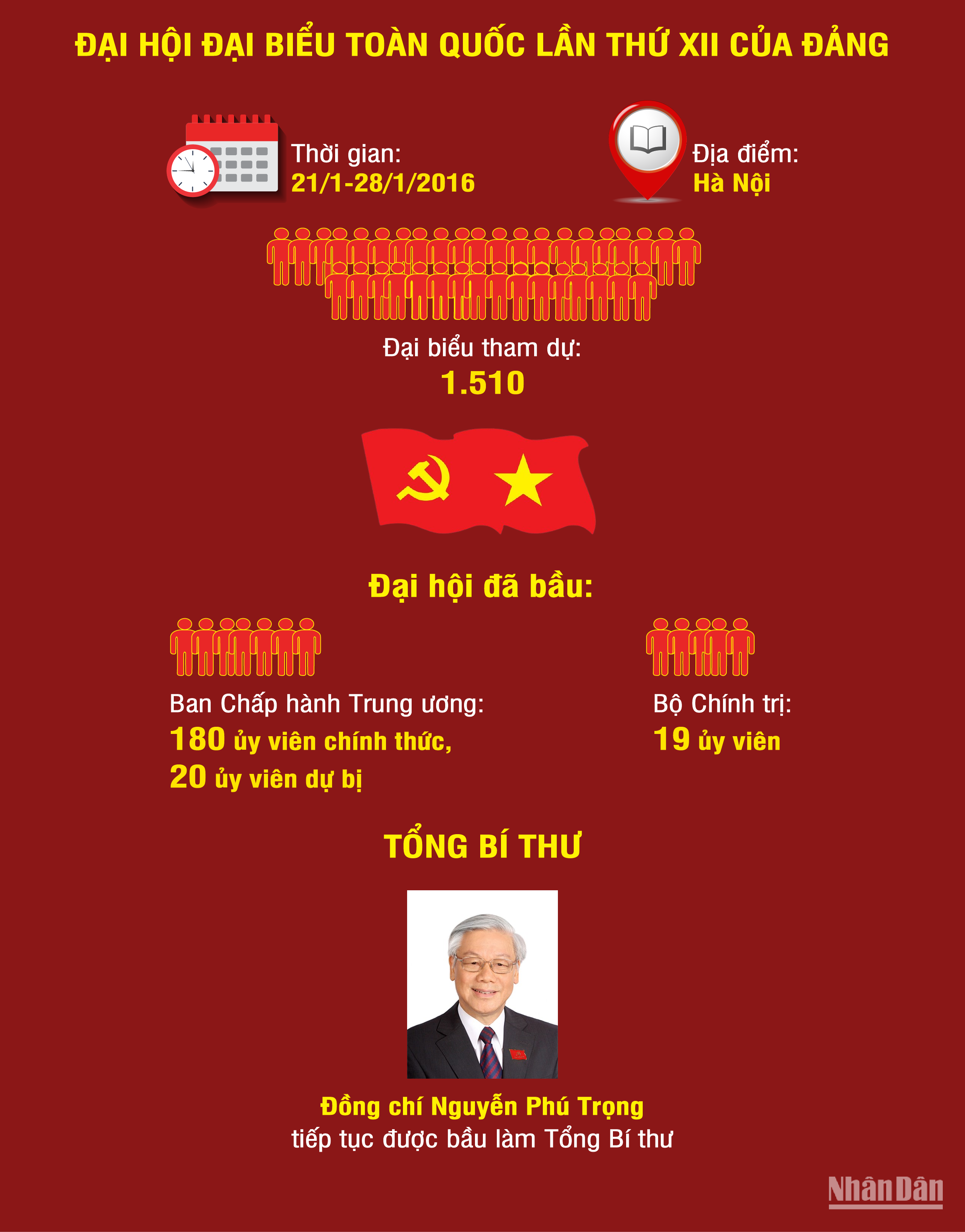 Đại hội đại biểu toàn quốc lần thứ XII của Đảng họp từ ngày 21/1 đến 28/1/2016, tại Thủ đô Hà Nội