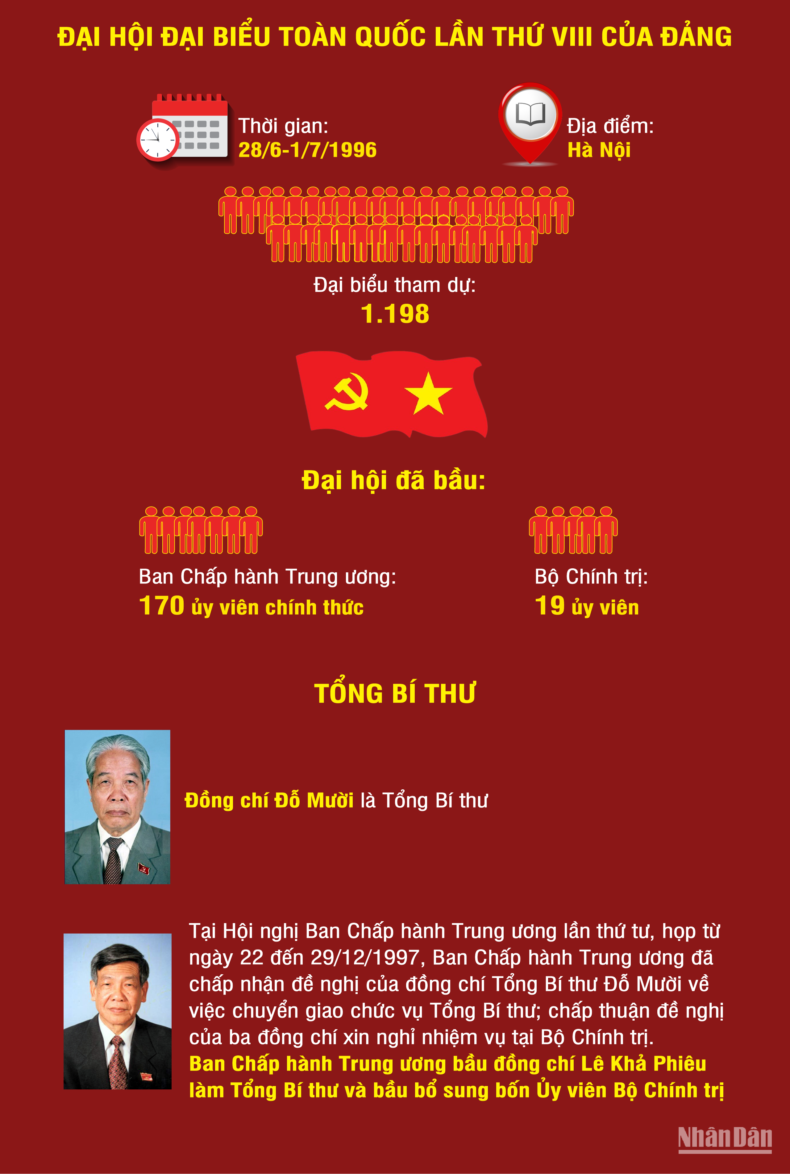 Đại hội đại biểu toàn quốc lần thứ VIII của Đảng họp từ ngày 28/6 đến 1/7/1996, tại Thủ đô Hà Nội