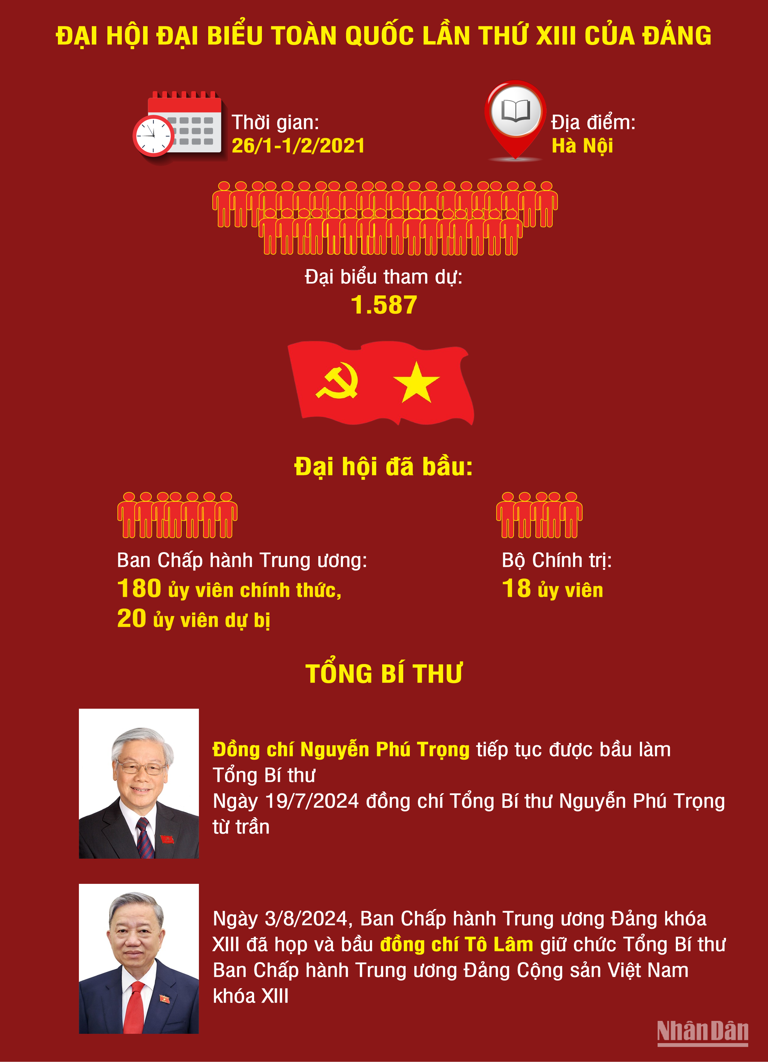 Đại hội đại biểu toàn quốc lần thứ XIII của Đảng họp từ ngày 26/1 đến 1/2/2021, tại Thủ đô Hà Nội