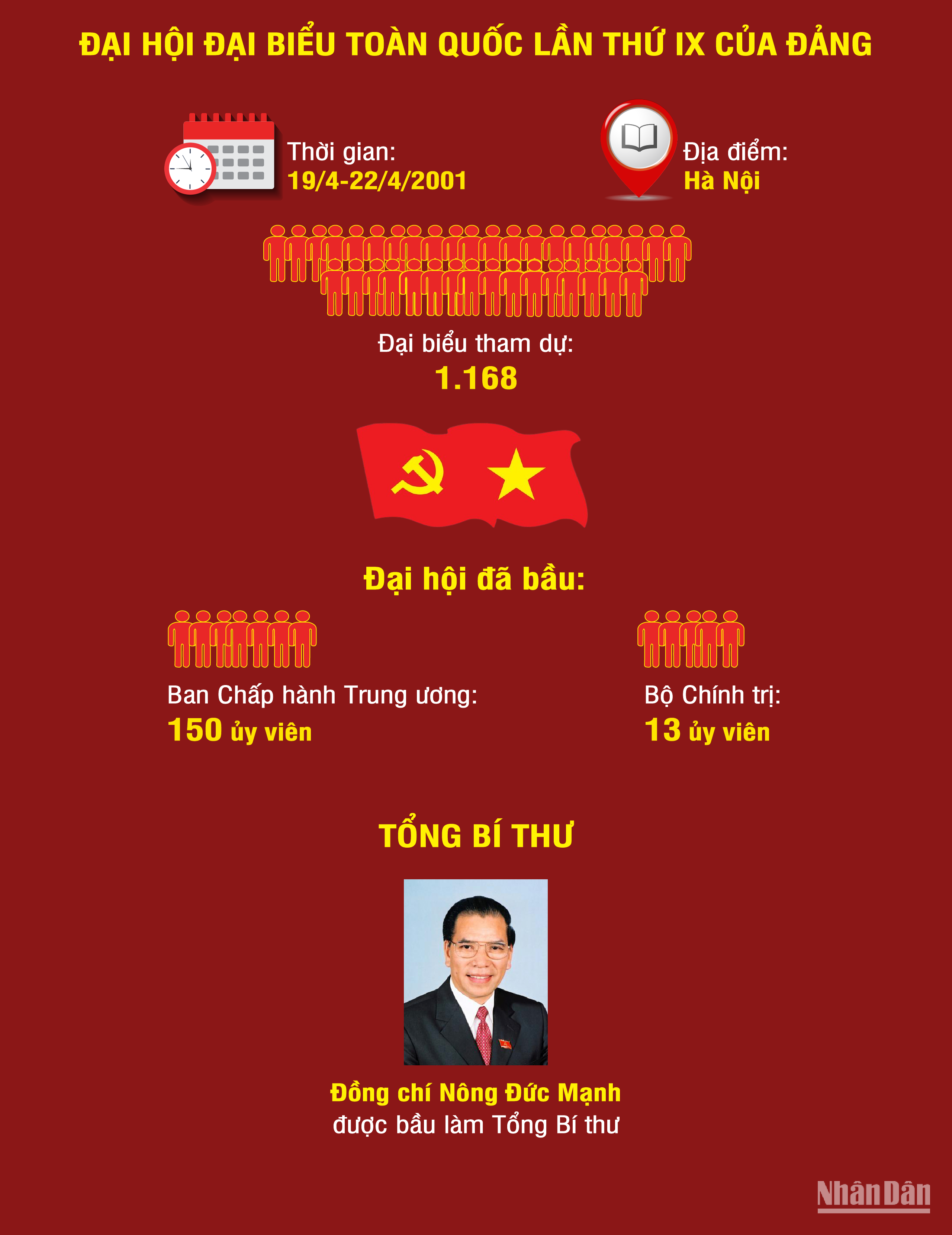 Đại hội đại biểu toàn quốc lần thứ IX của Đảng họp từ ngày 19/4 đến 22/4/2001, tại Thủ đô Hà Nội