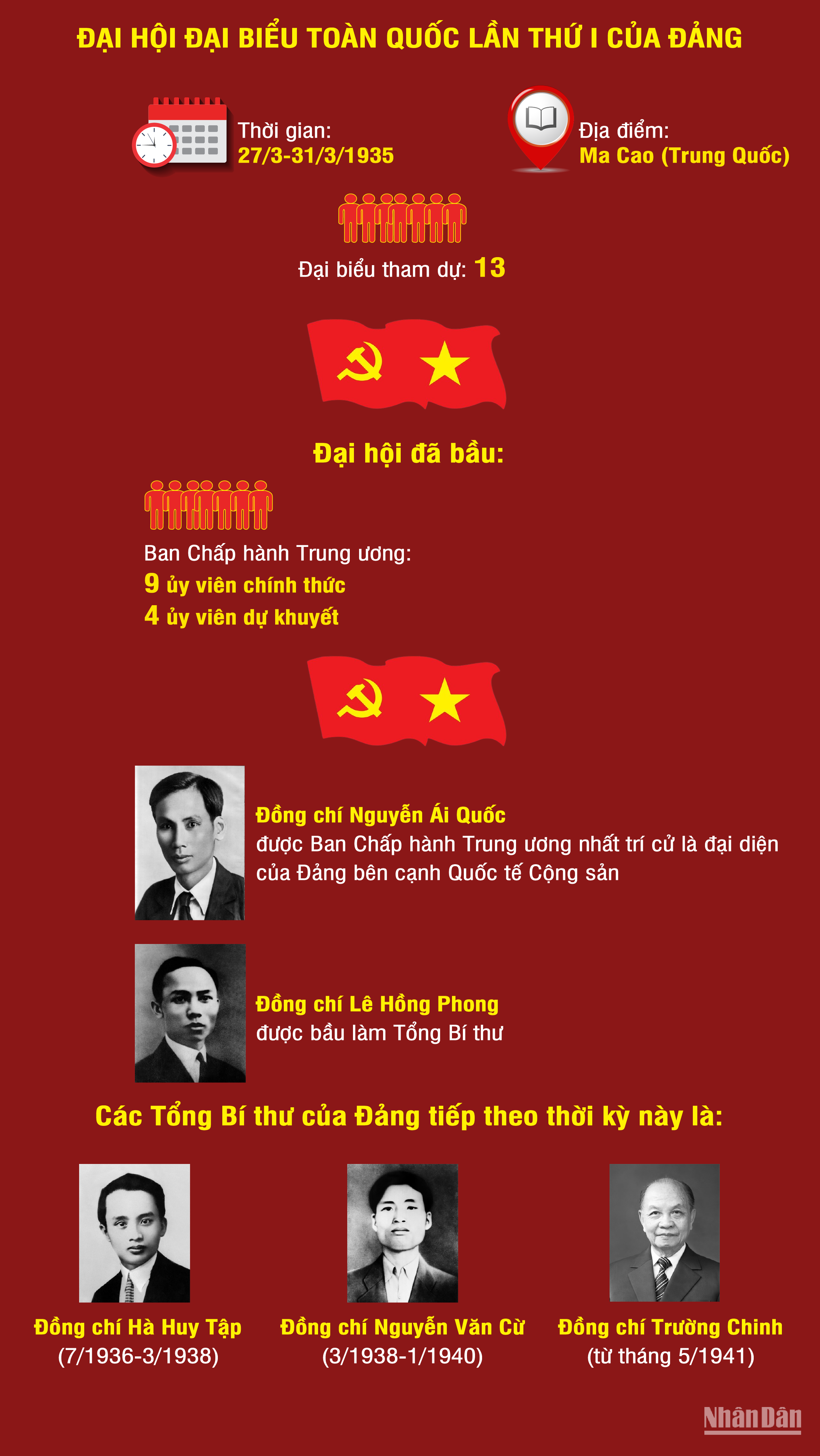 Đại hội đại biểu toàn quốc lần thứ I của Đảng họp từ 27/3 đến 31/3/1935, tại Ma Cao (Trung Quốc)