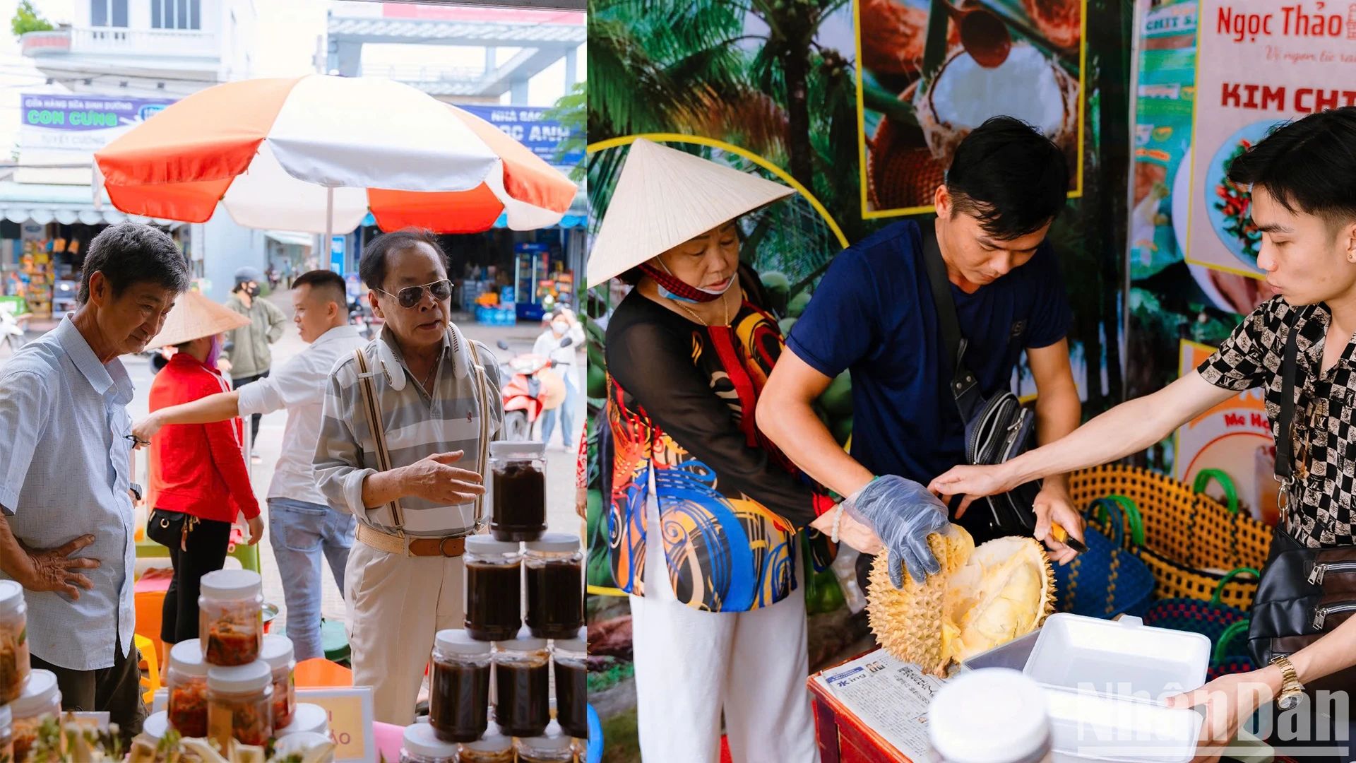 Người dân, du khách thưởng thức đặc sản trái cây tại các gian hàng trưng bày sản phẩm.