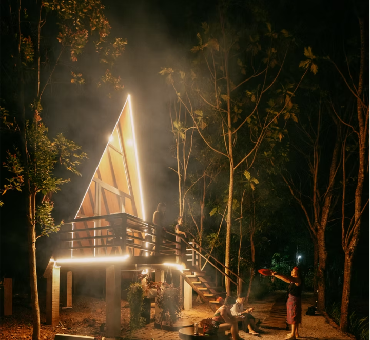 Du khách trải nghiệm không gian tại Suối Rao Ecolodge vào buổi tối.