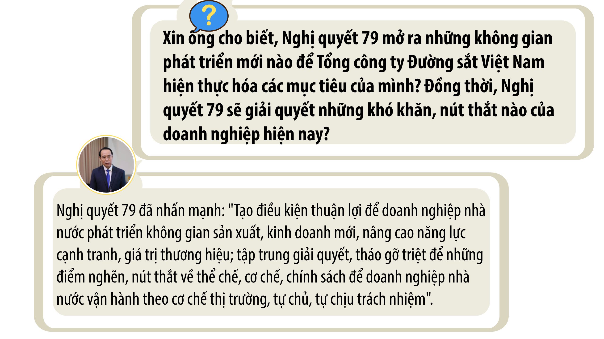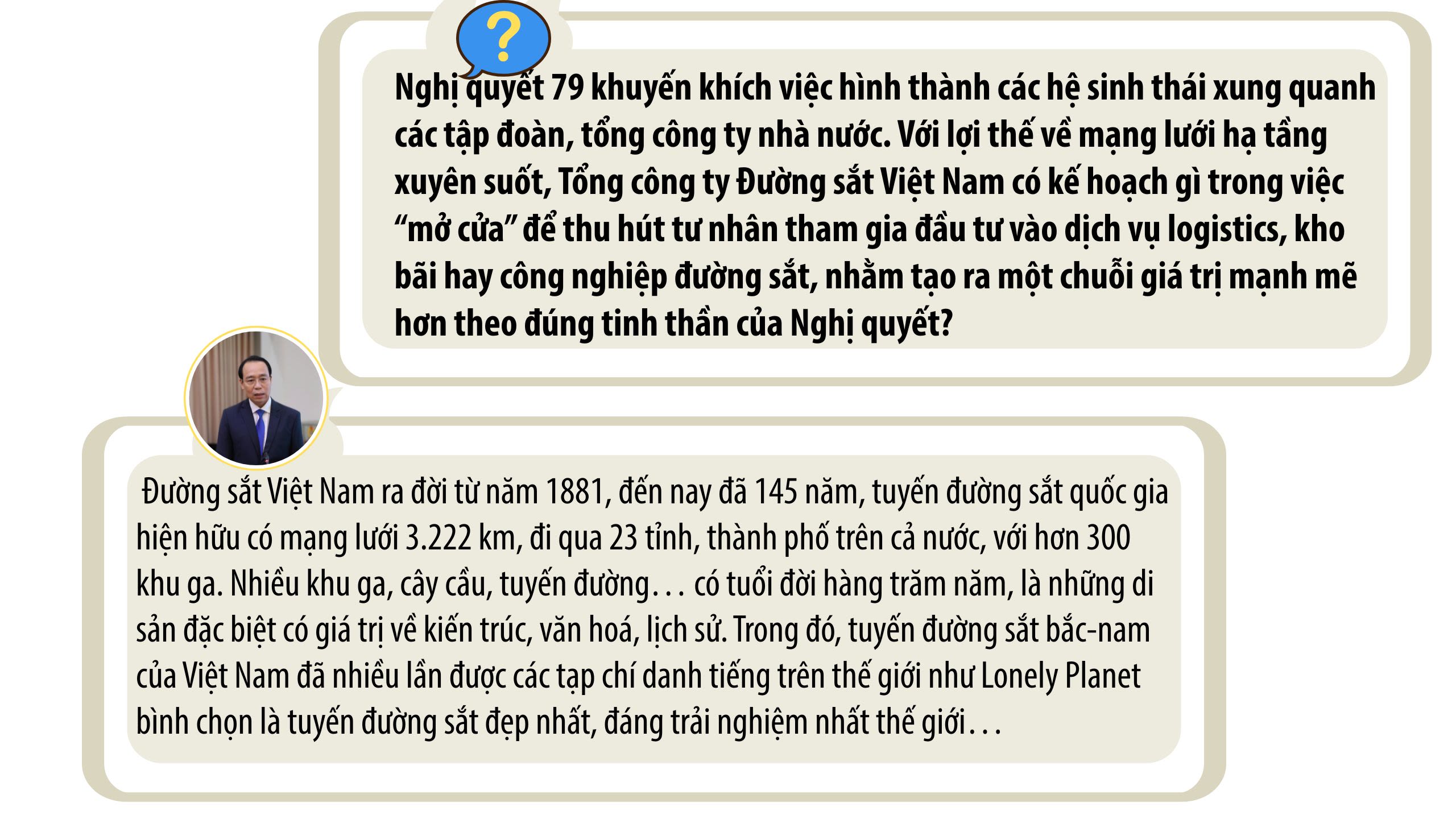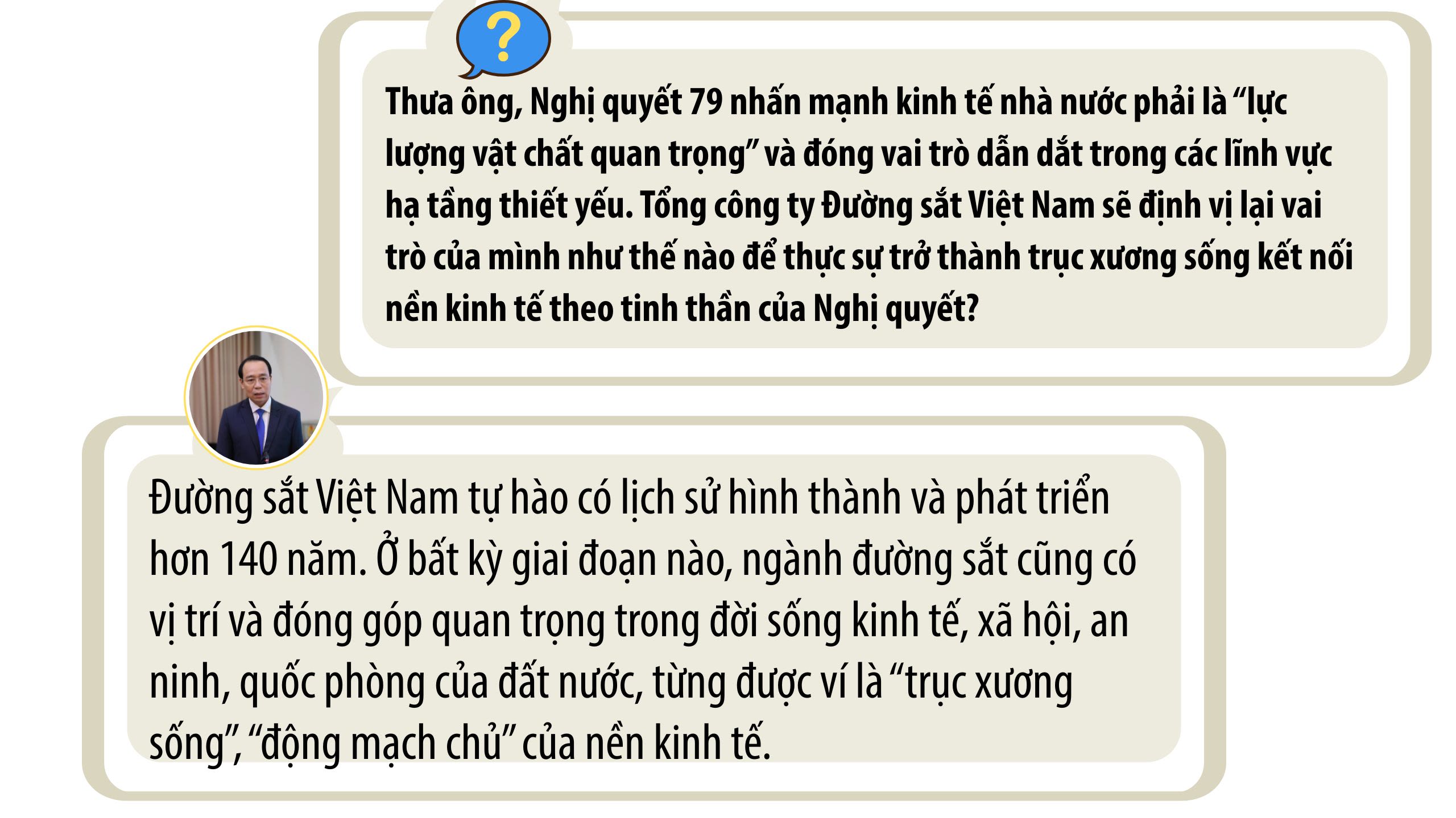 Chúng tôi xác định việc thực hiện Nghị quyết 79 là quá trình định vị lại vai trò của doanh nghiệp nhà nước trong lĩnh vực hạ tầng thiết yếu theo hướng dẫn dắt, kết nối nền kinh tế. Theo đó, khi Đảng và Nhà nước quan tâm đầu tư kết cấu hạ tầng đường sắt mới, hiện đại thì thị phần vận tải sẽ được sắp xếp lại với các tuyến đường sắt bắc-nam, kết nối Trung Quốc, kết nối cảng biển, khu công nghiệp, trung tâm logistic… thì chắc chắn vận tải đường sắt sẽ trở lại vị trí như trước đây.