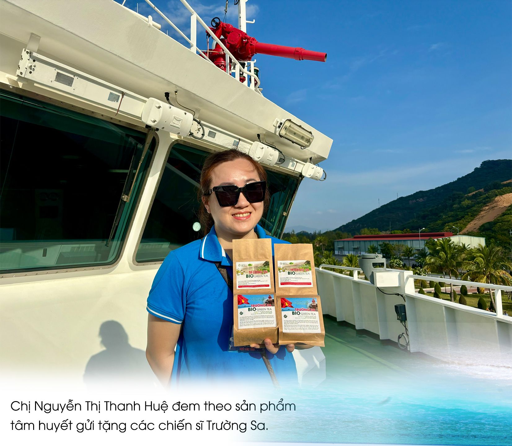 “Đây là những gói trà do công ty gia đình tôi sản xuất, lấy tên là “Trà xanh Trường Sa”. Mỗi sản phẩm bán ra, chúng tôi sẽ dành 15.000 đồng đóng góp vào quỹ dành tặng các chiến sĩ, bà con nơi hải đảo”, chị Huệ hồ hởi nói.