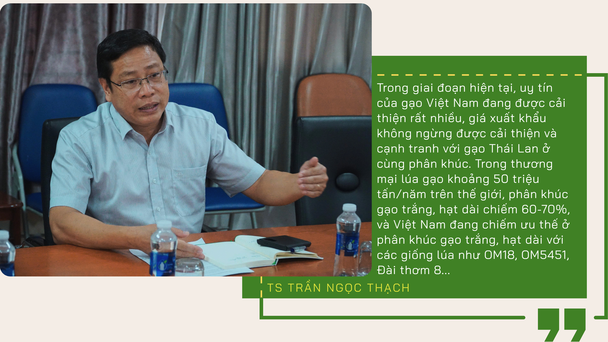Tiến sĩ Trần Ngọc Thạch: Theo số liệu báo cáo mới nhất (2024), hiện ở đồng bằng sông Cửu Long có khoảng 70 giống được gieo trồng, giống có diện tích trên 1.000ha/năm có khoảng 40 giống, trên 10.000ha/năm có khoảng 20 giống, trên 50.000 ha/năm có khoảng 10-15 giống và trên 100.000ha/năm chỉ có 5 giống, như vậy cơ cấu giống khá tập trung. Trong 5 giống chủ lực thì 3 giống thuộc phân khúc gạo trắng chiếm 65,2% diện tích gieo trồng hằng năm (OM18: 1.015.000ha, Đài Thơm 8: 780.000ha và OM5451: 635.000ha), còn lại là nếp IR4625 (265.000ha, chiếm 7,1% diện tích gieo trồng) và giống lúa Nhật DS1 (145.000ha, chiếm 3,91% diện tích gieo trồng).