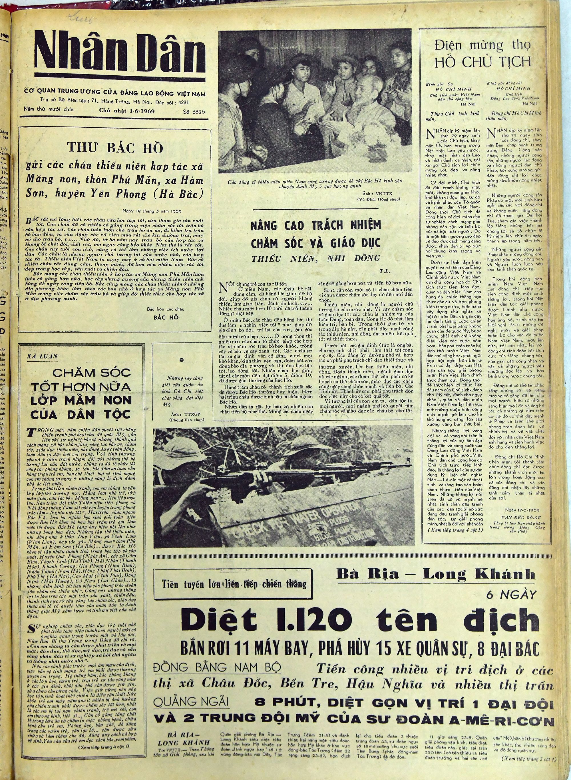 Báo Nhân Dân số 5526, ngày 1/6/1969 với bài viết của Bác dành cho sự nghiệp chăm sóc thiếu niên, nhi đồng.