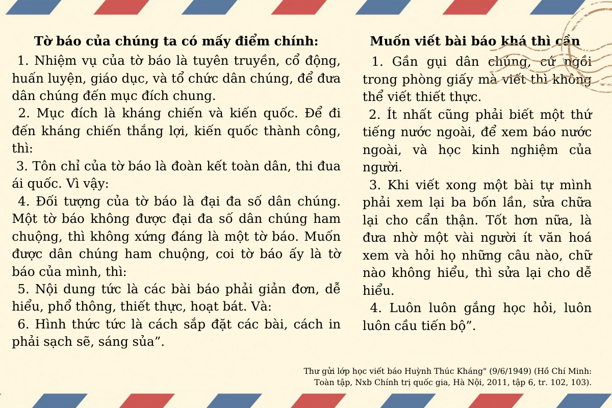 Nhà báo Hồ Chí Minh là một tấm gương mẫu mực để minh họa khi nói đến vai trò của báo chí trong việc phục vụ nhân dân, phục vụ xã hội.