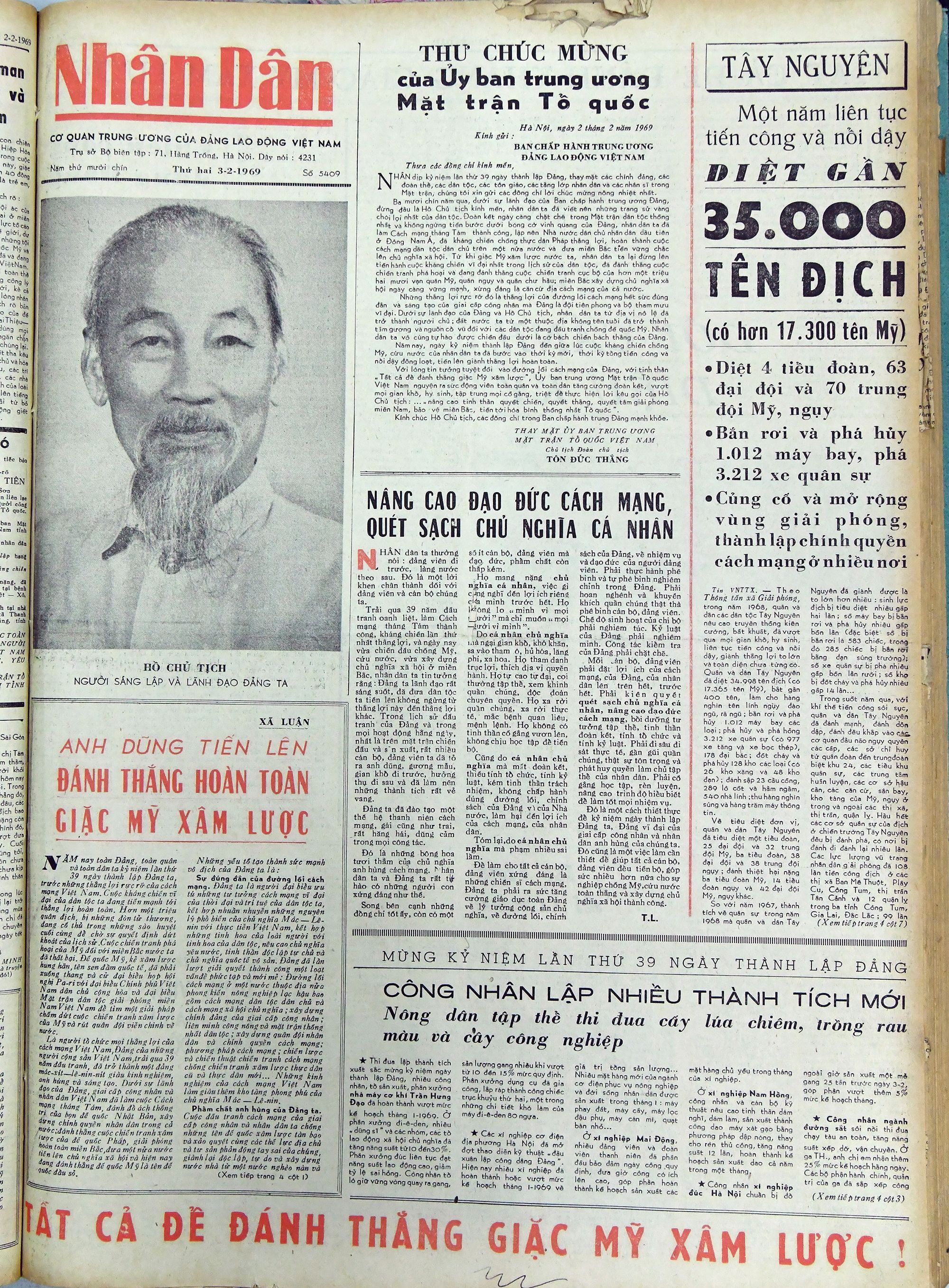 Bài viết "Nâng cao đạo đức cách mạng, quét sạch chủ nghĩa cá nhân" của Bác đăng trên Báo Nhân Dân, số 5409, ngày 3/2/1969.