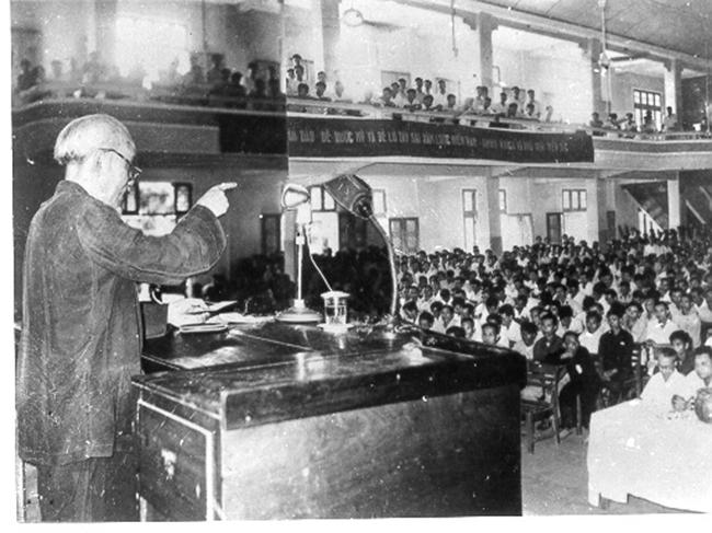 Bác Hồ nói chuyện tại buổi khai mạc lớp chỉnh huấn cán bộ Đảng, dân, chính ở cơ quan Trung ương (6/2/1953). Ảnh tư liệu