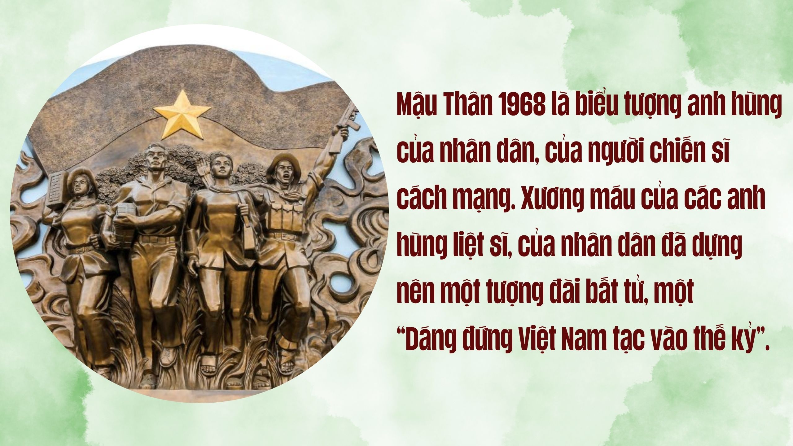 Cuộc Tổng tiến công và nổi dậy Xuân Mậu Thân 1968 đi vào lịch sử như một biểu tượng của khí phách Việt Nam, thắng lợi đỉnh cao của chiến tranh nhân dân. Nửa thế kỷ đi qua, nhưng bản hùng ca Xuân Mậu Thân vẫn vang mãi giai điệu tự hào trong lòng các thế hệ người Việt Nam, luôn thôi thúc chúng ta cùng góp sức đưa đất nước tiến lên mạnh giàu...