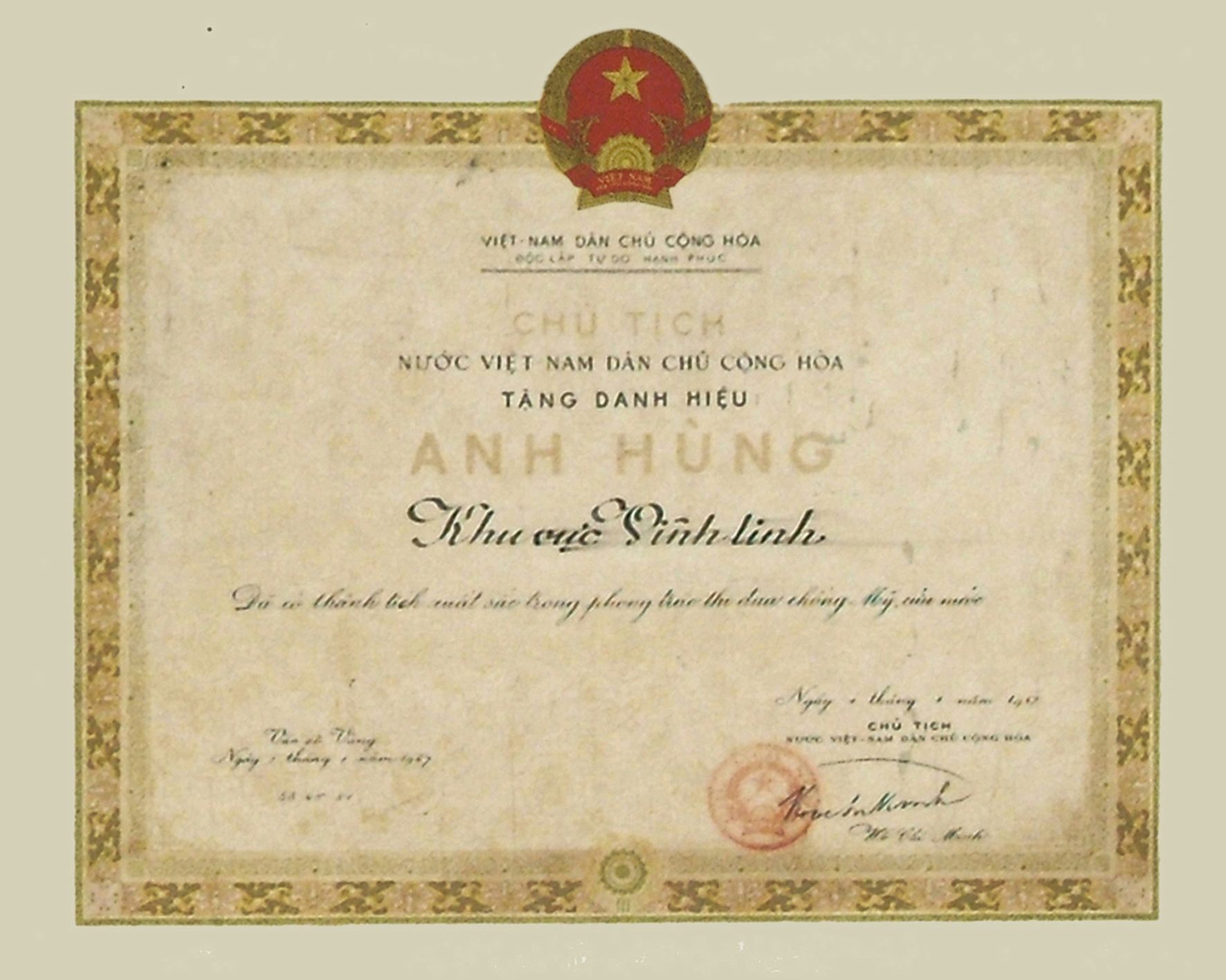 Ngày 1/1/1967, Chủ tịch Hồ Chí Minh ký quyết định phong tặng danh hiệu Anh hùng cho Khu vực Vĩnh Linh. Ảnh tư liệu
