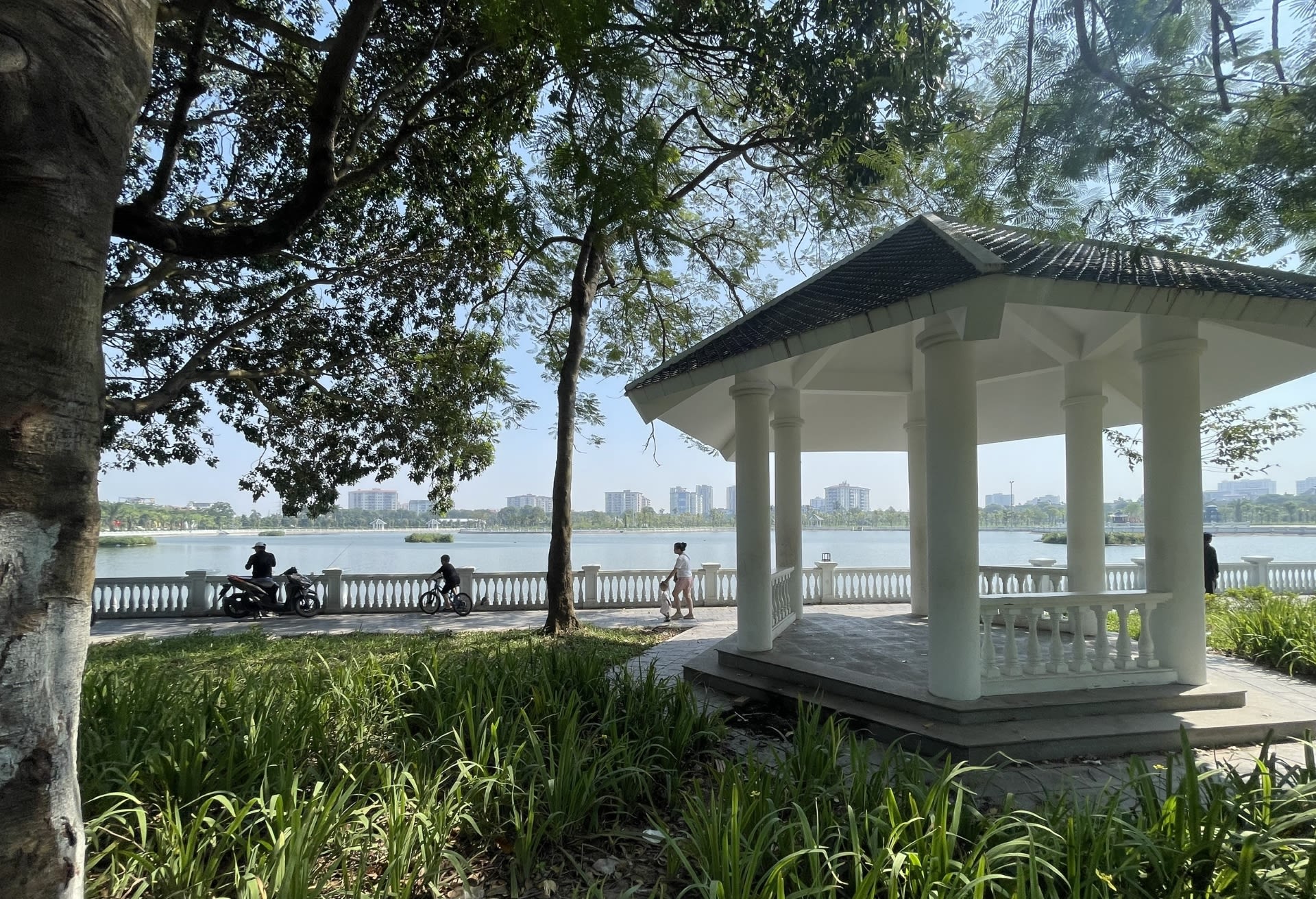 Công viên Long Biên với cây xanh, mặt nước thu hút người dân đến vui chơi, giải trí. Ảnh: Đắc Sơn.
