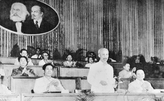 Chủ tịch Hồ Chí Minh, đồng chí Lê Duẩn (đầu tiên bên trái) tại lễ khai mạc Đại hội đại biểu toàn quốc lần thứ III Đảng Lao động Việt Nam, Hà Nội ngày 3/9/1960. (Ảnh: TTXVN)