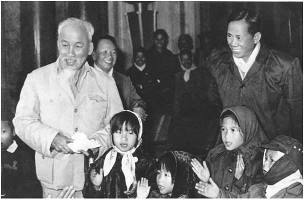 Chủ tịch Hồ Chí Minh, đồng chí Lê Duẩn và Chủ tịch Ủy ban thường vụ Quốc hội Trường Chinh cùng các cháu thiếu nhi tại Phủ Chủ tịch, Hà Nội, năm 1968. (Ảnh tư liệu)