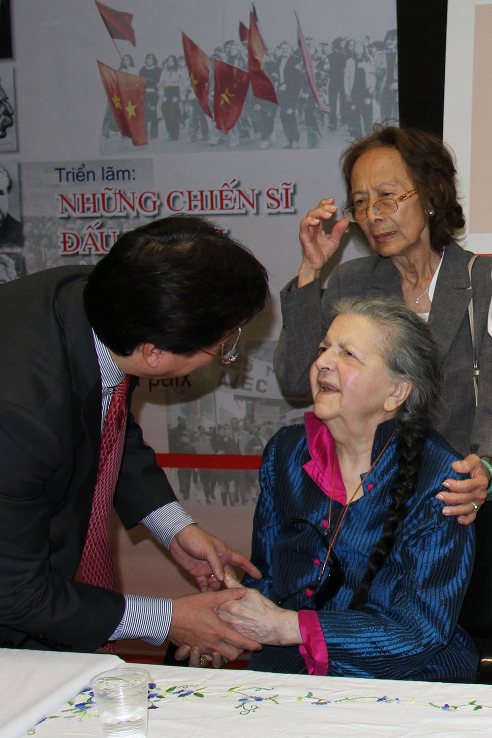 Đại sứ Việt Nam tại Pháp Dương Chí Dũng thăm hỏi bà Madeleine Riffaud tại cuộc gặp gỡ Những chiến sĩ đấu tranh vì hòa bình, diễn ra ở Paris, ngày 7/6/2014. (Ảnh: Khải Hoàn)