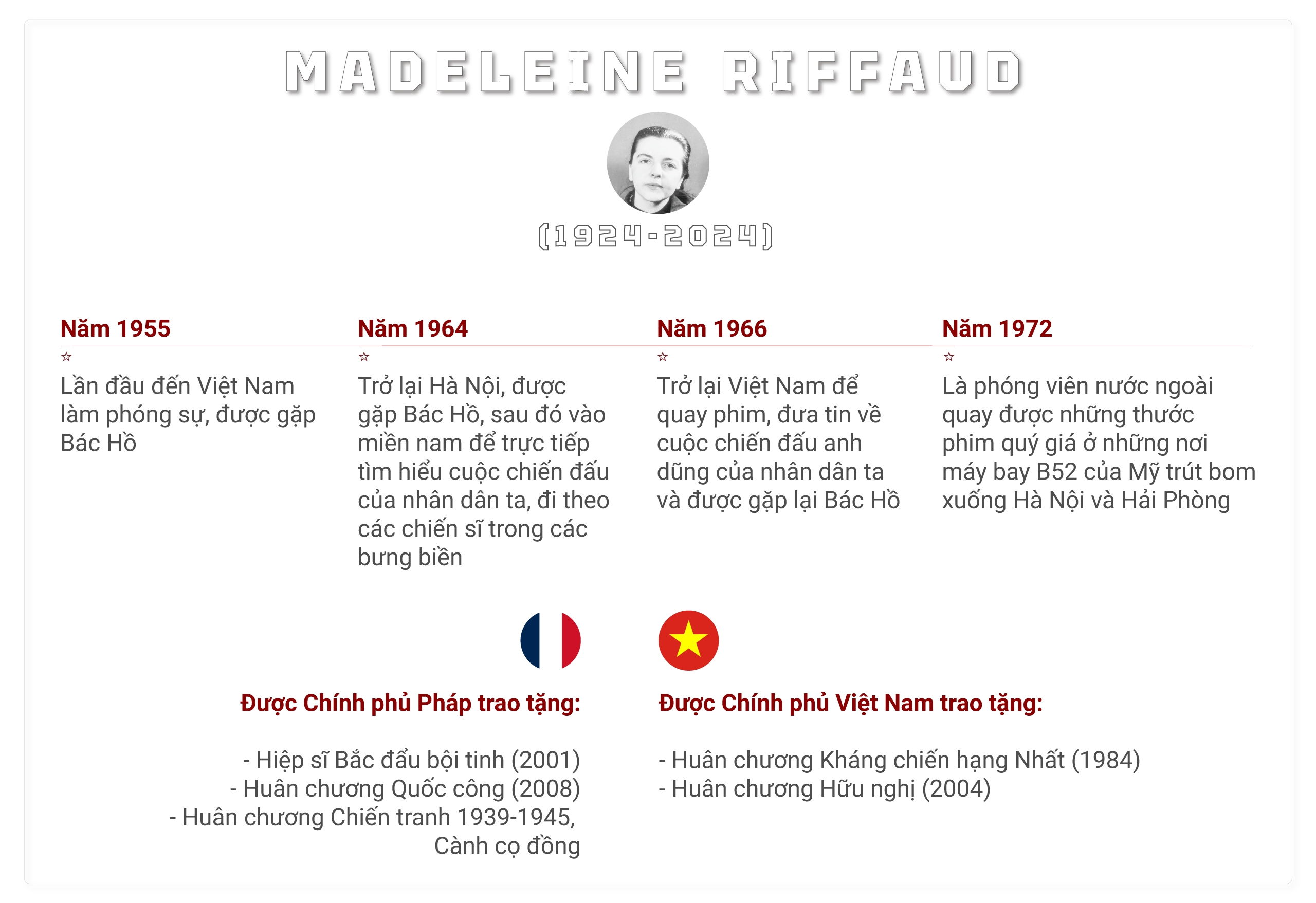 Ngày 6/11/2024, đồng chí Madeleine Riffaud đã trút hơi thở cuối cùng tại Paris, hưởng thọ 100 tuổi.