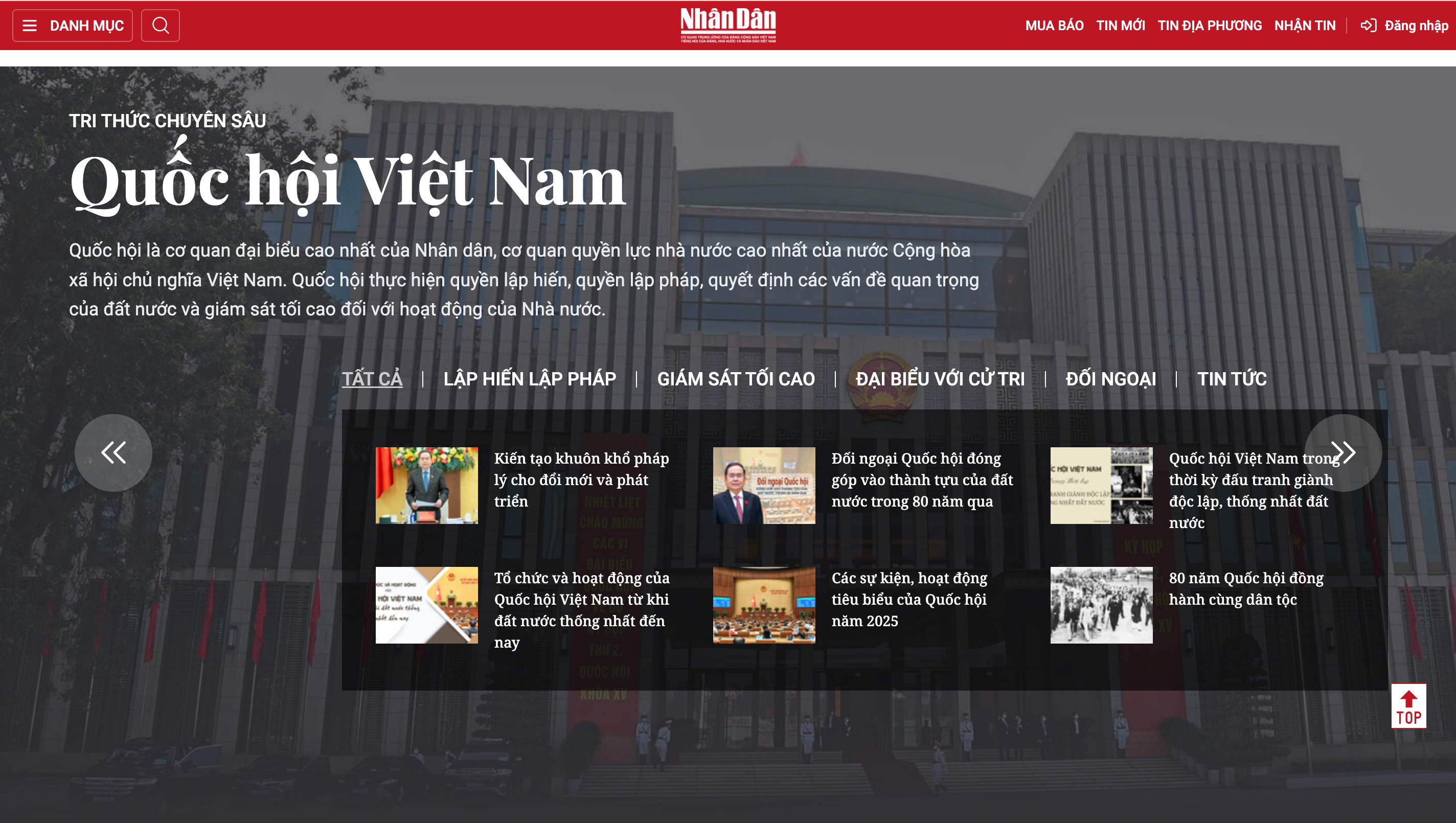 Với slogan “Mọi câu hỏi đều có lời giải”, mục Tri thức chuyên sâu là sản phẩm đặc biệt của Báo Nhân Dân điện tử nhằm cung cấp kiến thức tổng quan, chuyên sâu với cách trình bày công phu, đa phương tiện, hấp dẫn. Đến nay, Nhân Dân điện tử đã xây dựng được một khối lượng khá đồ sộ với 86 tri thức chuyên sâu thuộc nhiều lĩnh vực.