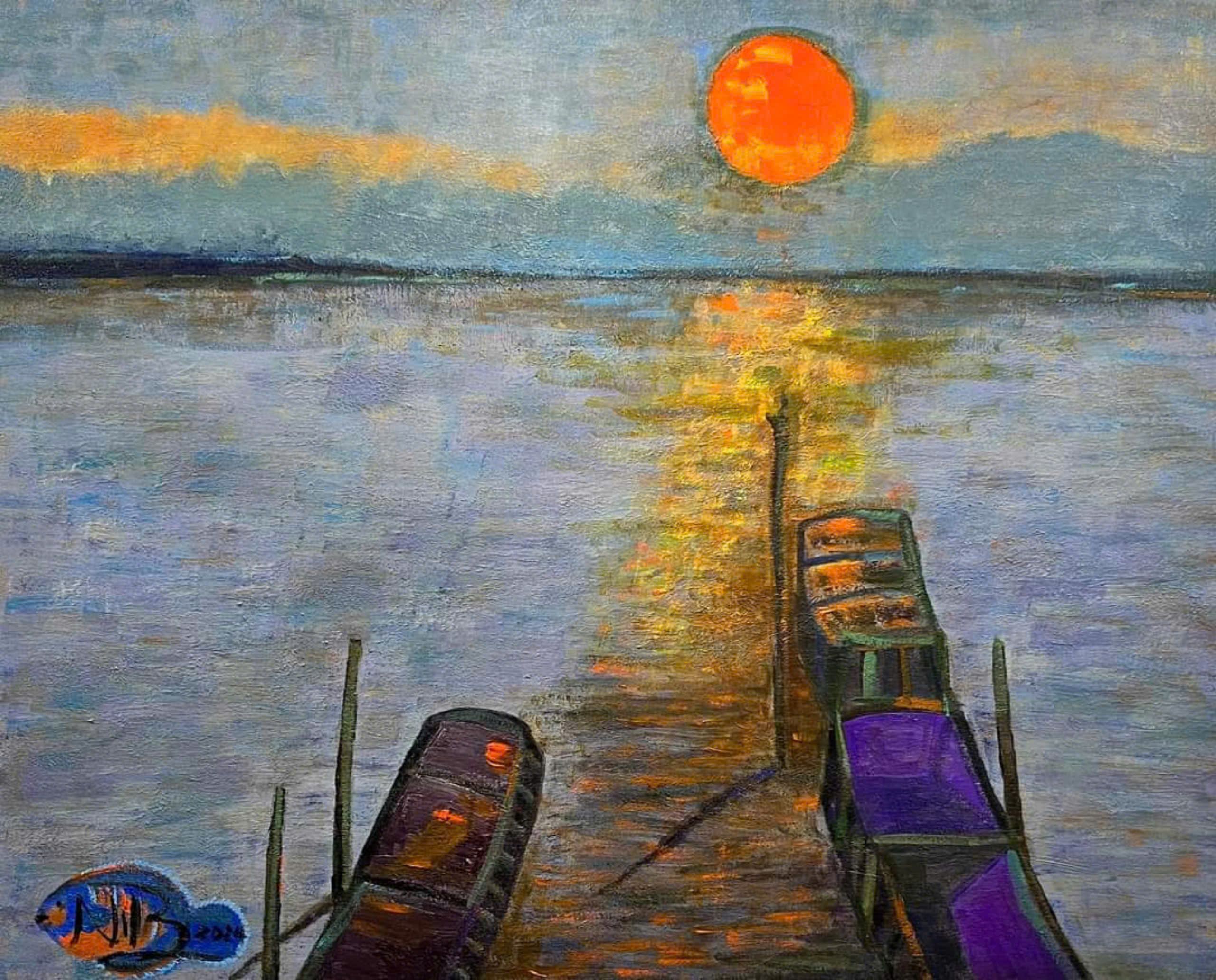 Tác phẩm: "Bình minh trên sông". Kích thước: 80x100. Chất liệu: Acrylic trên toan. Sáng tác năm 2024.