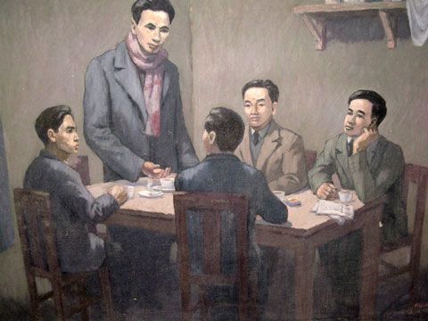 Tranh vẽ "Lãnh tụ Nguyễn Ái Quốc chủ trì cuộc họp thành lập Đảng Cộng sản Việt Nam ngày 3/2/1930". (Nguồn: Bảo tàng Lịch sử Quốc gia)