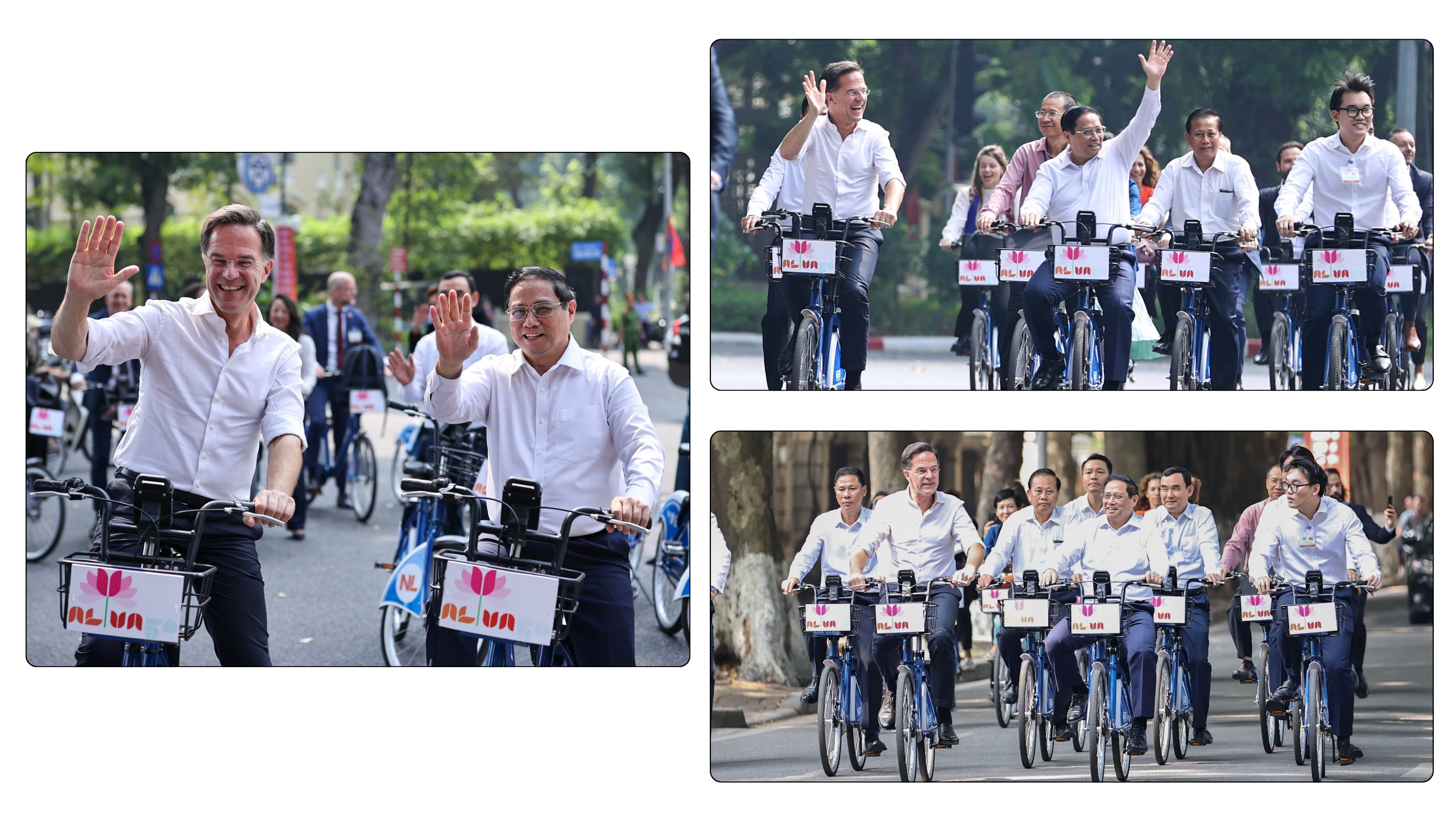 Thủ tướng Phạm Minh Chính và Thủ tướng Hà Lan cùng đạp xe dạo phố Hà Nội.