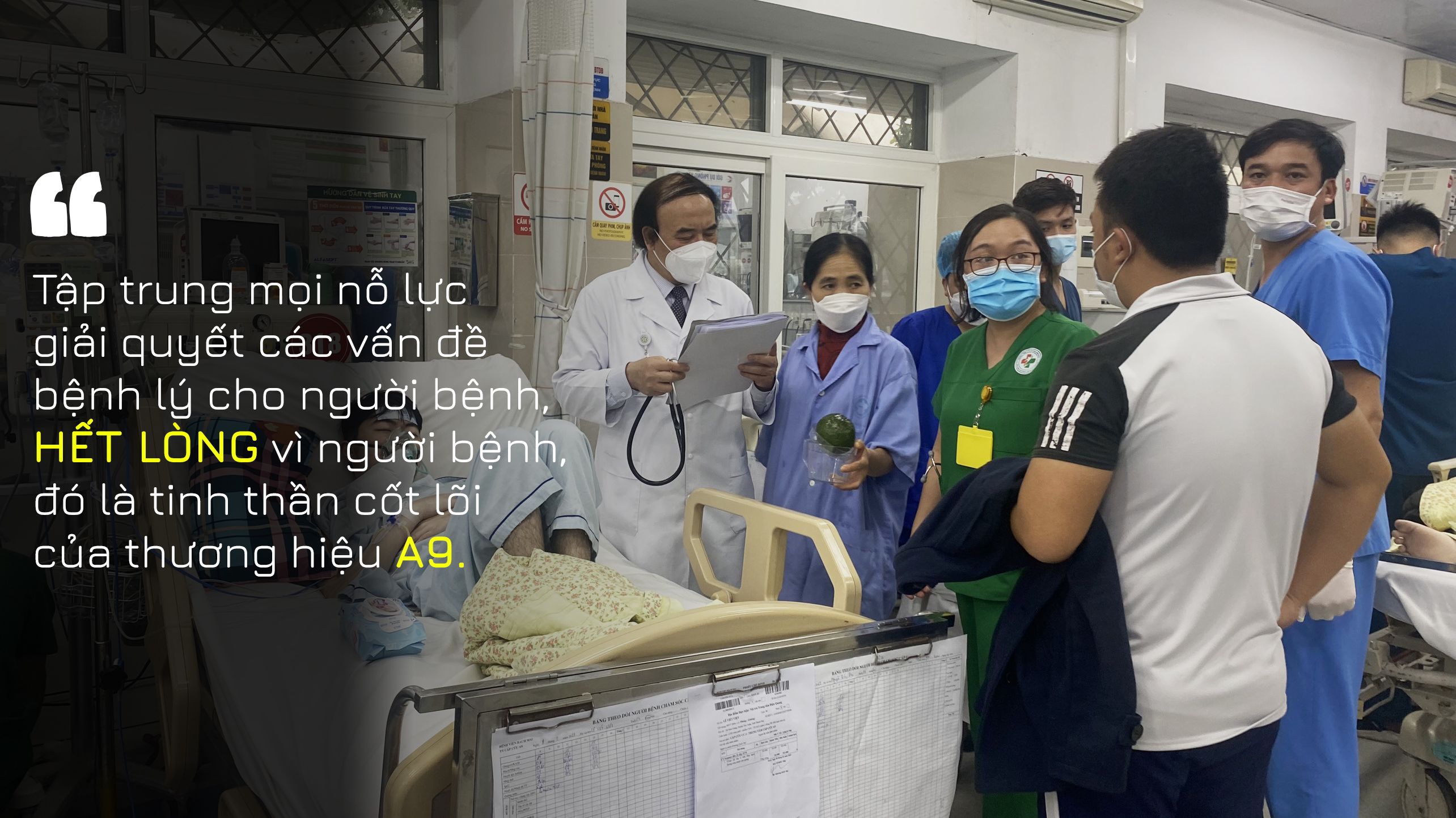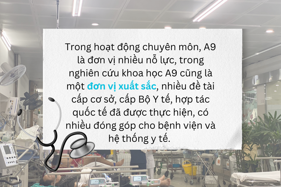 Trong công việc hàng ngày, A9 đơn vị tiếp nhận bệnh nhân rất nặng từ các nơi chuyển đến. Đây là nơi ban đầu có tác động ngay đến với người bệnh, tác động ngay đến gia đình người bệnh, do đó các bác sĩ vừa phải thực hiện tiếp nhận, khám đánh giá phát hiện sớm các vấn đề của bệnh nhân, thực hiện kịp thời các can thiệp chuyên sâu cho người bệnh, vừa phải thực hiện trách nhiệm trao đổi với gia đình người bệnh để gia đình yên tâm, tập trung mọi nỗ lực giải quyết các vấn đề bệnh lý cho người bệnh, hết lòng vì người bệnh, đó là tinh thần cốt lõi của thương hiệu A9 từ xưa đến nay. Do đó, A9 đã che chắn được các vấn đề chuyên môn, sớm phát hiện các vấn đề bệnh lý bất thường như bệnh nhân có bệnh dịch để thực hiện các can thiệp chuyên môn cho người bệnh, bảo đảm an toàn cho bệnh viện.