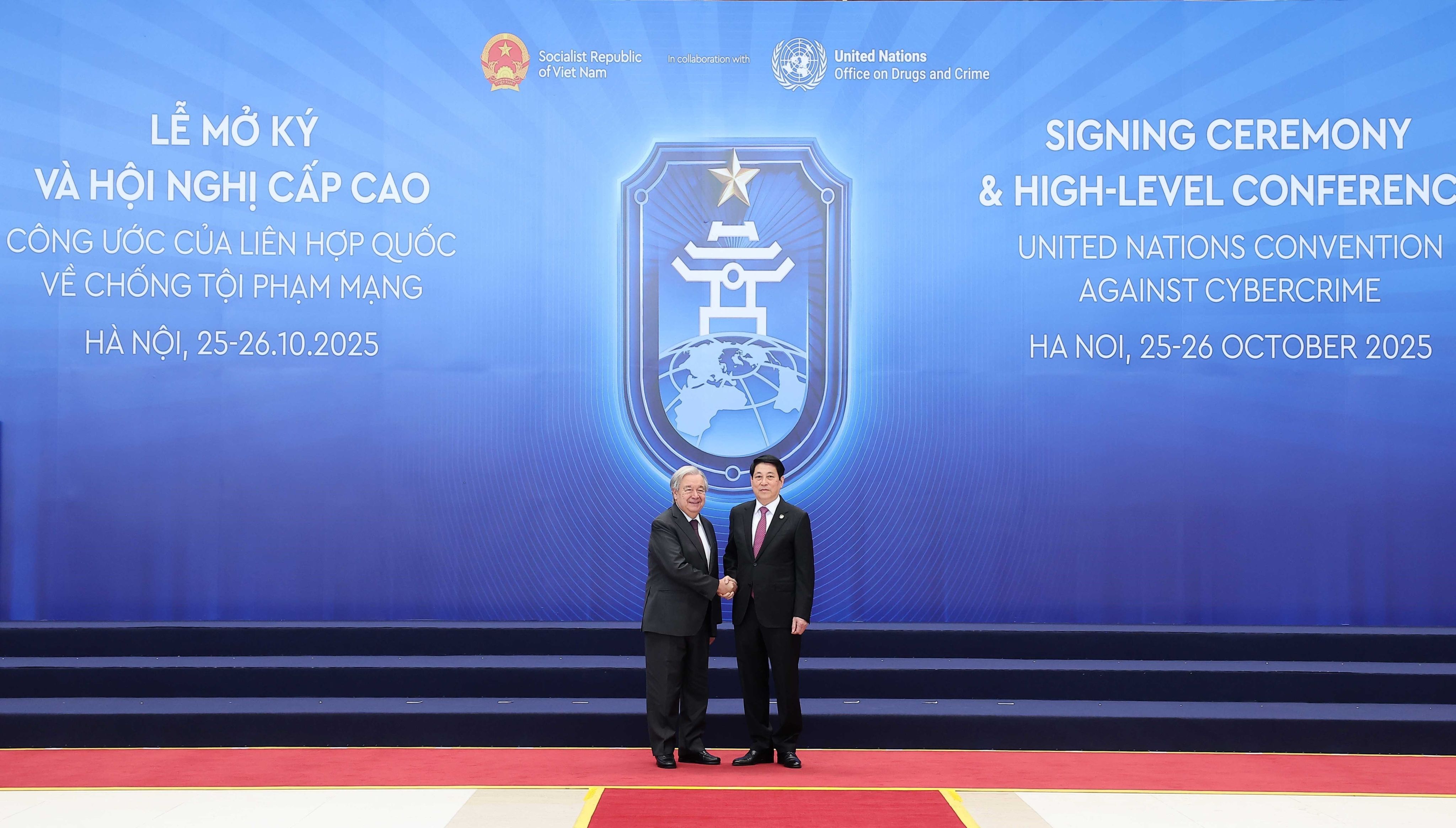 Chủ tịch nước Lương Cường và Tổng Thư ký Liên hợp quốc António Guterres đồng chủ trì Lễ mở ký và Hội nghị cấp cao Công ước của Liên hợp quốc về chống tội phạm mạng (Công ước Hà Nội). (Ảnh: TTXVN)